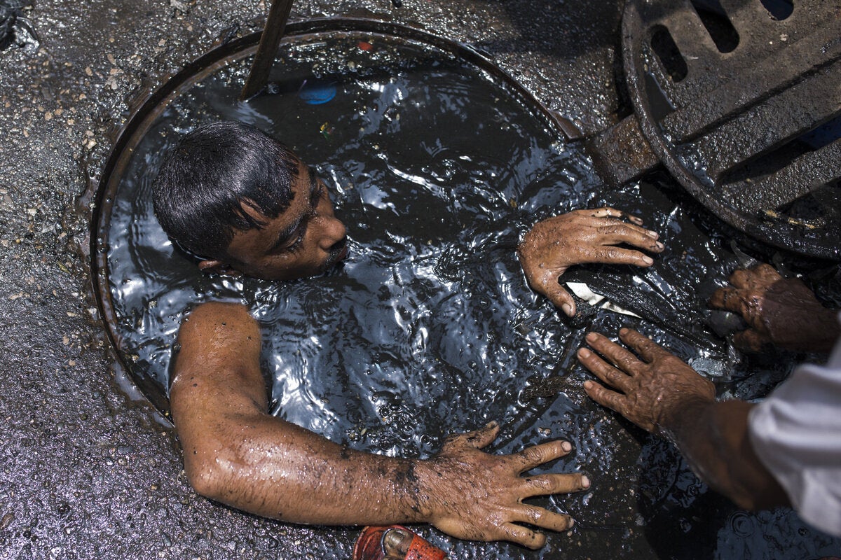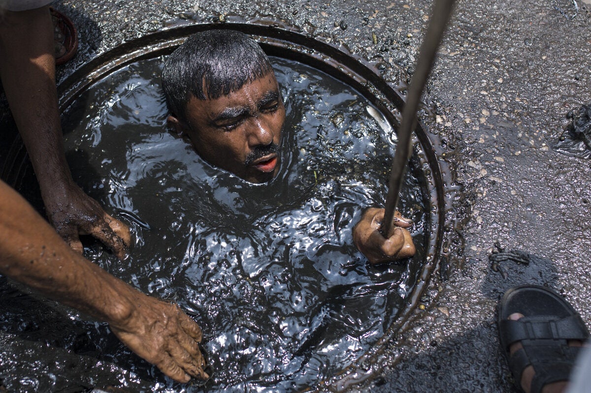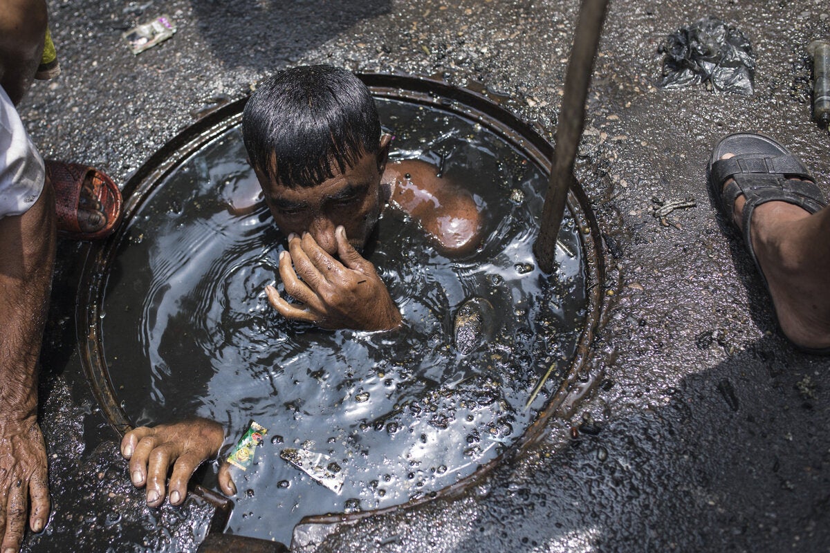 Όπως μπορείτε να δείτε και στις φωτογραφίες, ένας καθαριστής υπονόμων στο Μπαγκλαντές εκτελεί τα καθήκοντά του χωρίς καν να φορά την κατάλληλη προστατευτική στολή. Ούτε καν ένα ζευγάρι πλαστικά γάντια.