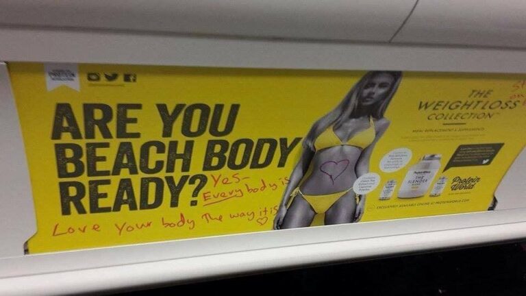 Η αφίσα της Protein World απεικονίζει ένα καλλίγραμμο μοντέλο, το οποίο συνοδεύεται από την ερώτηση «εσένα είναι το σώμα σου έτοιμο για την παραλία;».