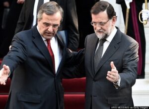 Έφερε άρον-άρον τον Ισπανό πρωθυπουργό Μαριάνο Ραχόι, να δώσει μια χείρα βοηθείας μπας και κερδηθεί αυτή η μάχη. Έχει και τους Podemos κι εκείνος που τον σκιάζουν, έχουν κάνει και κολεγιά με τον Τσίπρα, κοινός εχθρός, σου λέει. Είπε λοιπόν ο Ραχόι, ότι πρέπει να συνεχιστούν οι πολιτικές που έχουν δρομολογηθεί και ότι ο ίδιος είναι μάρτυρας της δυναμικής προσπάθειας του Σαμαρά να βγάλει τη χώρα από την κρίση, χαρακτηρίζοντάς τον «πραγματικό ηγέτη». Να φανταστώ ότι θα ανταποδώσει το κάλεσμα -και τις φιλοφρονήσεις- και ο Σαμαράς στις ισπανικές εκλογές.