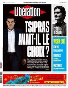 «Ο Τσίπρας, είχε δυνατότητα επιλογής;» είναι το πρωτοσέλιδο ερώτημα της Liberation στο οποίο επιχειρεί να δώσει απαντήσεις σε εξασέλιδο εσωτερικό αφιέρωμα.Στο κύριο άρθρο, ο διευθυντής της εφημερίδας Λωράν Ζοφρέν, δίνει τη δική του ερμηνεία θεωρώντας ότι ως «υπεύθυνος πολιτικός άνδρας,ο πρωθυπουργός Αλέξης Τσίπρας, επέλεξε τελικά ανάμεσα «στη φωτιά και το εθνικό συμφέρον».