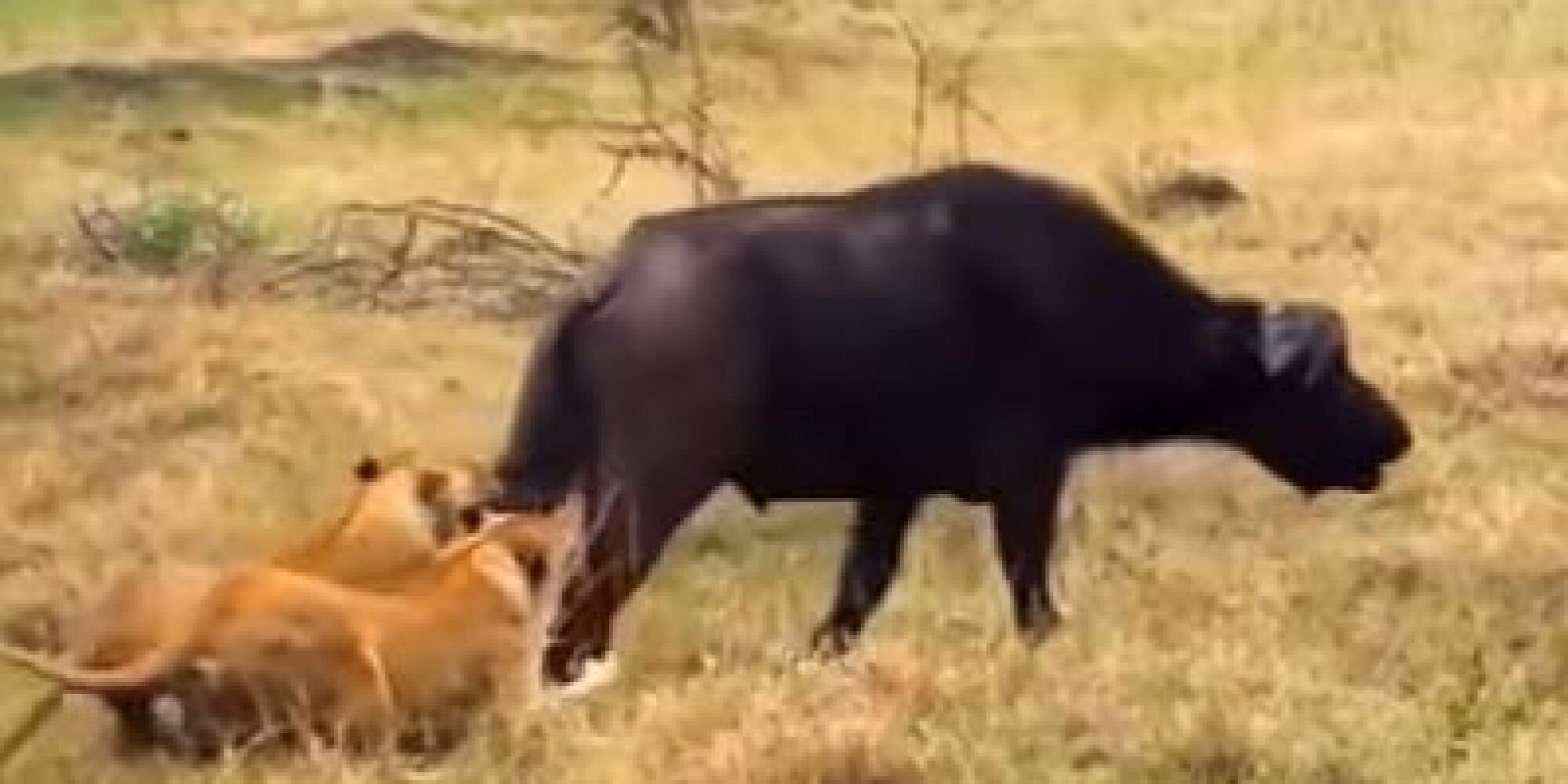 Λιοντάρια αρχίζουν να τρώνε ζωντανό ένα βουβάλι μέχρι τη στιγμή που δέχονται συντονισμένη επίθεση από το κοπάδι