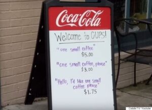 «Ένα καφεδάκι: 5 δολάρια», «Ένα καφεδάκι, παρακαλώ: 3 δολάρια», «Γεια σας, ένα καφεδάκι, παρακαλώ: 1,75 δολάρια» έγραψε σε πίνακα έξω από την καφετέριά του ο μπάρμαν Τζάστιν.