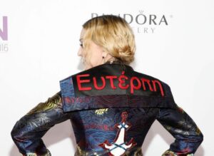 Για έναν μέσο Έλληνα βέβαια η μεγαλύτερη έκπληξη δεν ήταν η έτσι κι αλλιώς αναμενόμενη βράβευση της αλλά τα ρούχα της. Φορούσε ένα κουστούμι Gucci, και στο πίσω μέρος από το σακάκι της ήταν κεντημένο το όνομα «Ευτέρπη». Πέρα από το αστείο του πράγματος (ας μας συγχωρήσουν οι απανταχού Ευτέρπες αλλά συνήθως το όνομα Ευτέρπη θυμίζει κάποια 85χρονη γιαγιά που πλέκει), χάρη στη Madonna θυμηθήκαμε πως η Ευτέρπη ήταν η μούσα της μουσικής. Eυχαριστούμε λοιπόν τη Madonna και τον Οίκο Gucci που μας την θύμισαν.