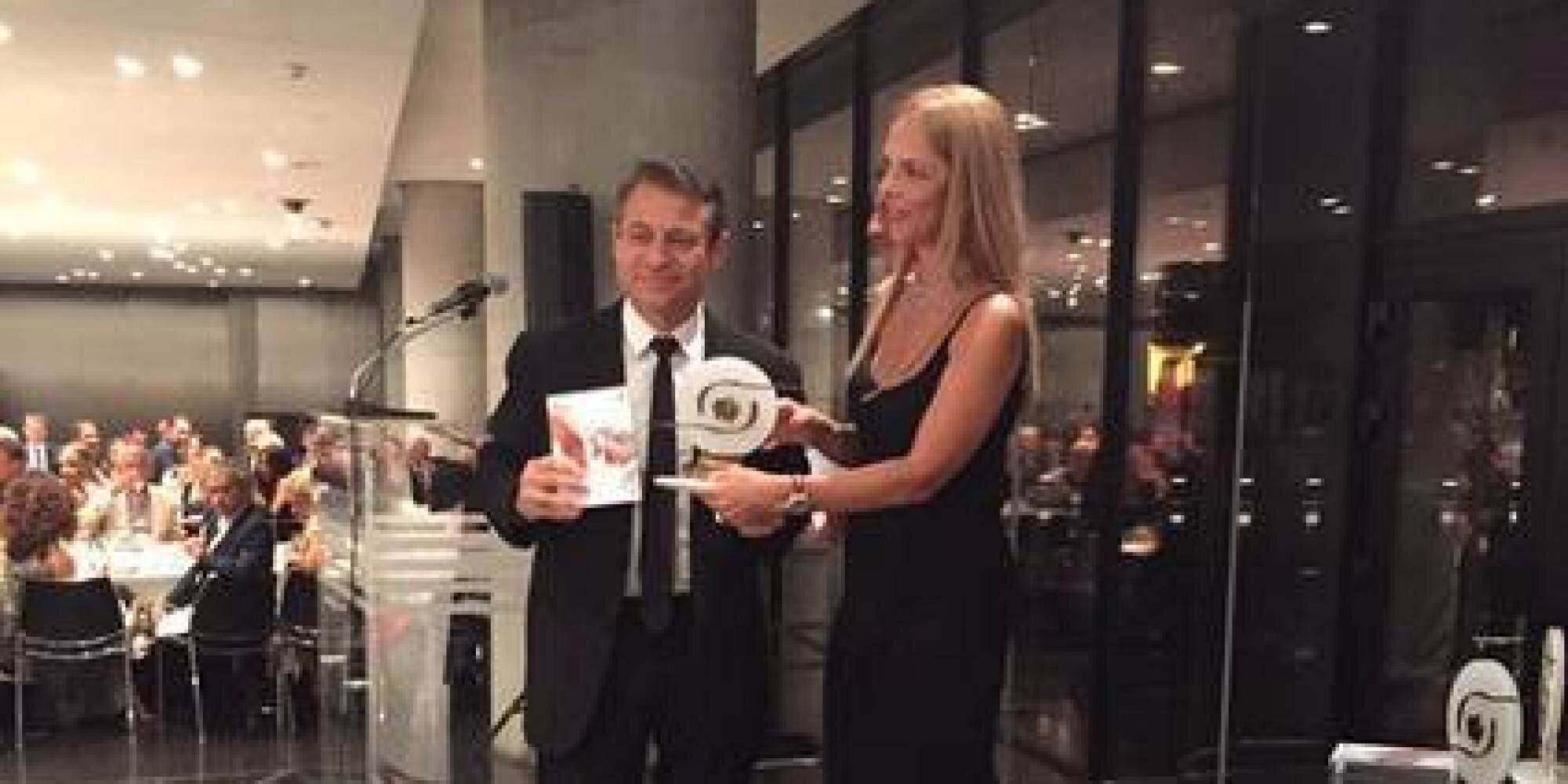 Ο Τζον Κατσιματίδης παραλαμβάνει το βραβείο και το γραμματόσημο από την πρόεδρο του Ιδρύματος, Ασπασία λεβέντη