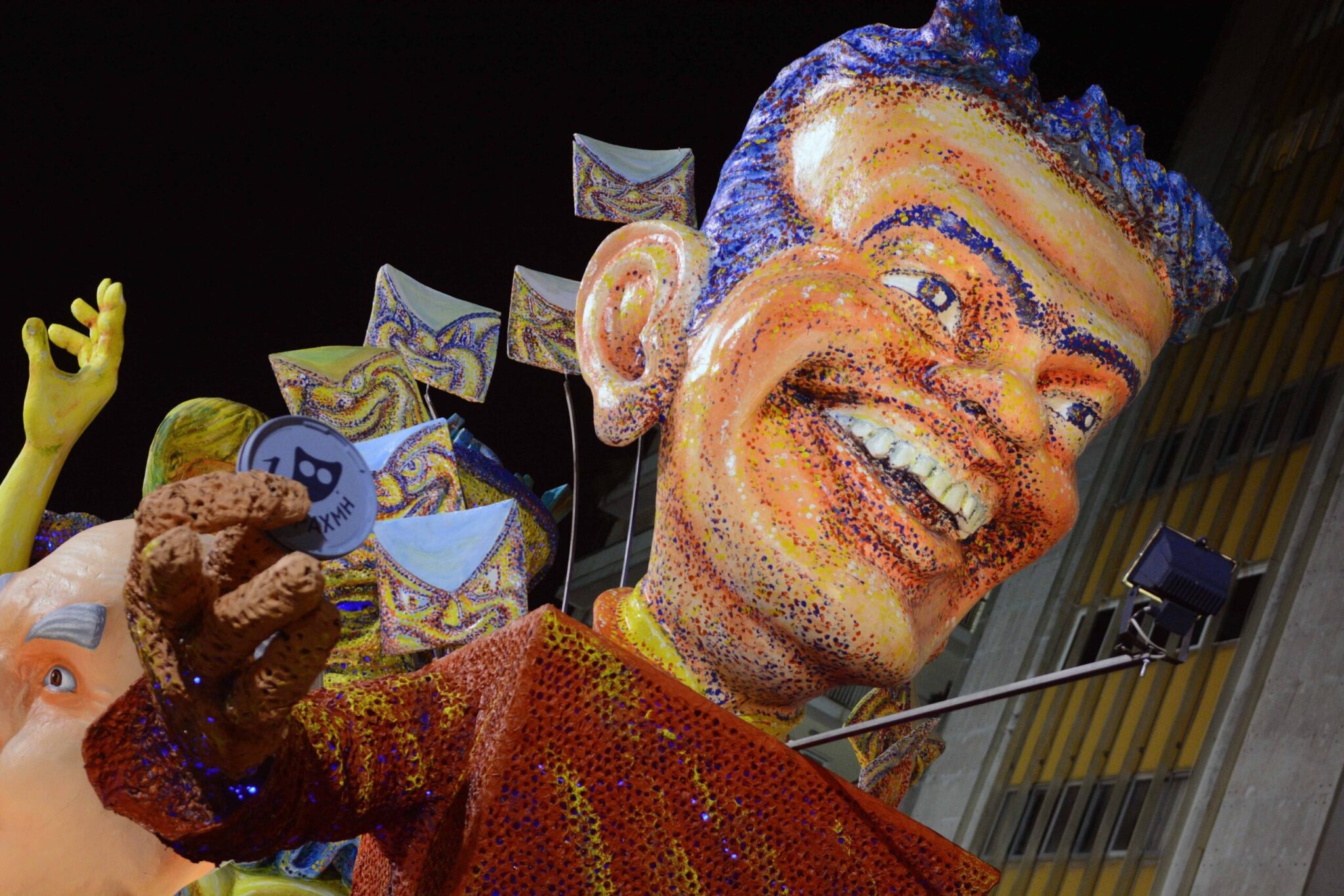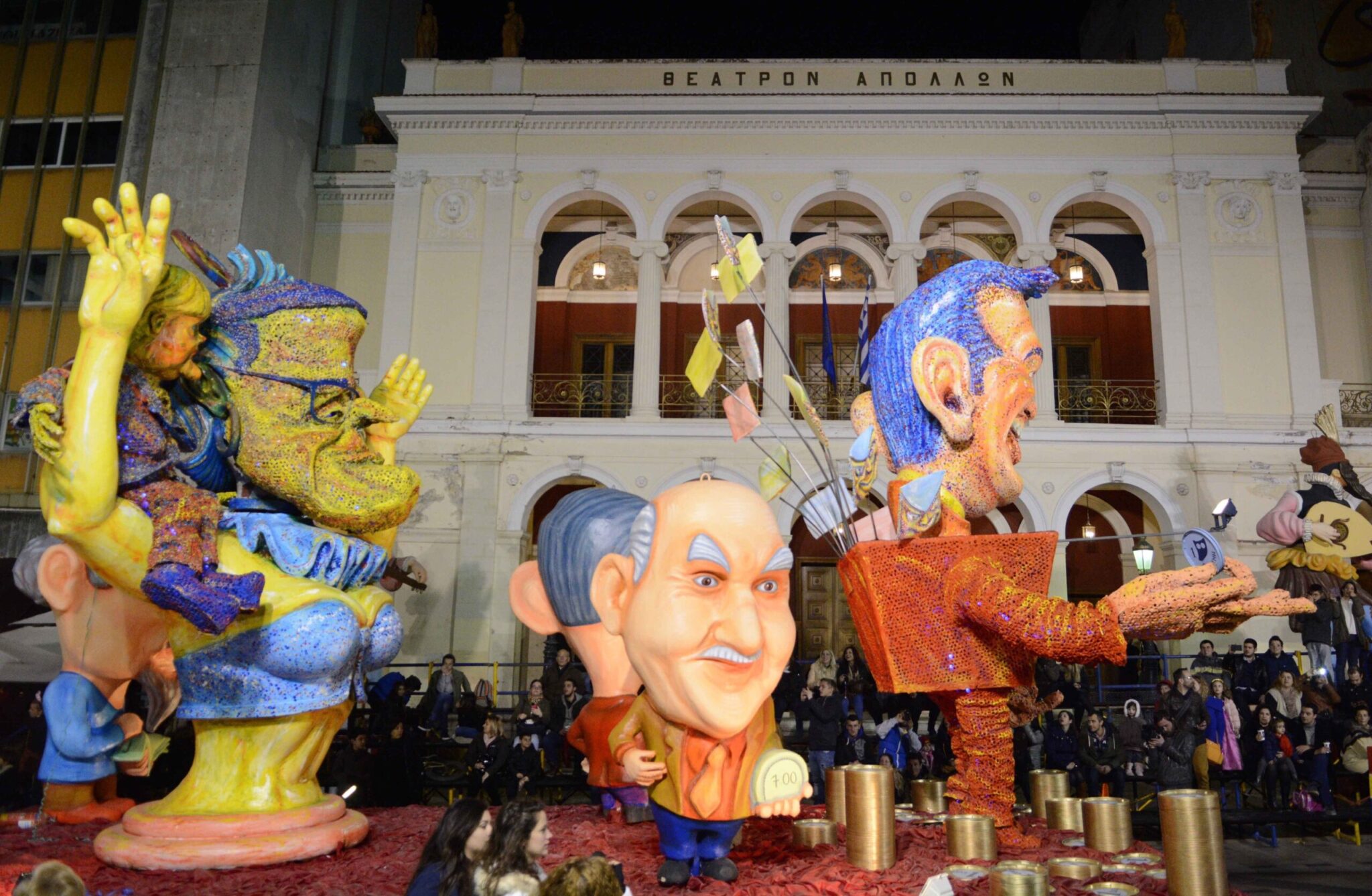 Ειδικότερα το σατιρικό άρμα με θέμα «Εκλογές 2015» περιλαμβάνει το πολιτικό προσωπικό της επικαιρότητας, δηλαδή τον Αλέξη Τσίπρα, τον Αντώνη Σαμαρά και την Άγγελα Μέρκελ. Ειδικότερα υπάρχει η φιγούρα του Αντώνη Σαμαρά με τη μορφή χορεύτριας-χανούμισσας και η φιγούρα της ‘Αγγελας Μέρκελ σε μικρό μέγεθος πάνω στο μπράτσο του, που τού ψιθυρίζει κάτι στο αυτί. Τριγύρω τους οι φιγούρες τεσσάρων δημοσιογράφων και εκπροσώπων των μέσων μαζικής ενημέρωσης, επισημαίνουν ότι όλα είναι κανονισμένα και καθοδηγούμενα. Μπροστά βρίσκεται η χαμογελαστή φιγούρα του Αλέξη Τσίπρα, που είναι σε μπλε, κόκκινο, κίτρινο και λευκό χρώμα, έχοντας ως κορμί μια κάλπη με χέρια και πόδια γεμάτη ψηφοδέλτια μέσα από ένα περιβάλλον με ευρώ και ψηφοδέλτια, ενώ κρατά ένα ευρώ και μια δραχμή.