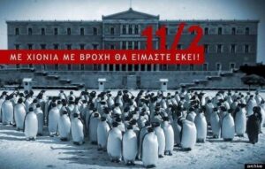 Τι κι αν παγώσουμε, τι κι αν αναγκαστούμε να γίνουμε πιγκουϊνοι, την Τετάρτη, 11 Φεβρουαρίου, με χιόνια με βροχή θα είμαστε εκεί, στην πλατεία Συντάγματος.