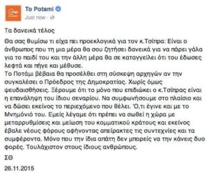 Σε ανάρτηση του στο facebook ο κ. Θεδοωράκης κάνει λόγο για «απάτη» από την πλευρά του κ. Τσίπρα και αναφέρει χαρακτηριστικά: «τα δανεικά τέλος».