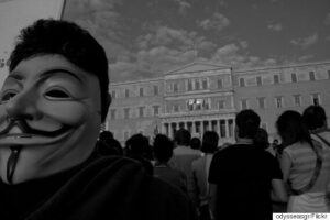 Η κυρίαρχη αφήγηση έδωσε το όνομα «αγανακτισμένοι» στο κίνημα των πλατειών, αν και ο όρος αυτός δεν χρησιμοποιήθηκε ούτε σε ένα ψήφισμα της συνέλευσης.Επίσης, η κυρίαρχη αφήγηση, ήδη από τον Οκτώβριο του 2011, είχε έτοιμη την ετυμηγορία για τις πλατείες. Μια ετυμηγορία, που μέχρι τη δολοφονία του Φύσσα, έδωσε πρώτης τάξης υλικό στο μύλο της «θεωρίας των δύο άκρων», ενώ στη συνέχεια τα ιδεολογικά-πολιτικά όρια μπορεί να περιορίστηκαν, ωστόσο για ένα κομμάτι της δημόσιας σφαίρας το Σύνταγμα δεν ήταν πάρα η εκλογική παιδική χαρά του ΣΥΡΙΖΑ και των ΑΝΕΛ με ένα χαλασμένο συντριβανάκι στη μέση. Στο μεταξύ, βέβαια, κάποιοι στην πλατεία μιλούσαν επί δύο μήνες για άμεση δημοκρατία -αλλά μάλλον η μικροφωνική δεν ήταν αρκετά δυνατή για να ακουστούν.