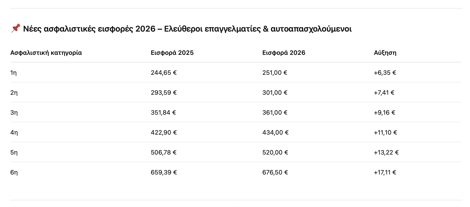 Αυξημένες ασφαλιστικές εισφορές επιφυλάσσει το 2026 για ελεύθερους επαγγελματίες, αυτοαπασχολούμενους και αγρότες, καθώς από την 1η Ιανουαρίου τίθεται σε ισχύ η ετήσια αναπροσαρμογή των εισφορών του e-ΕΦΚΑ.
