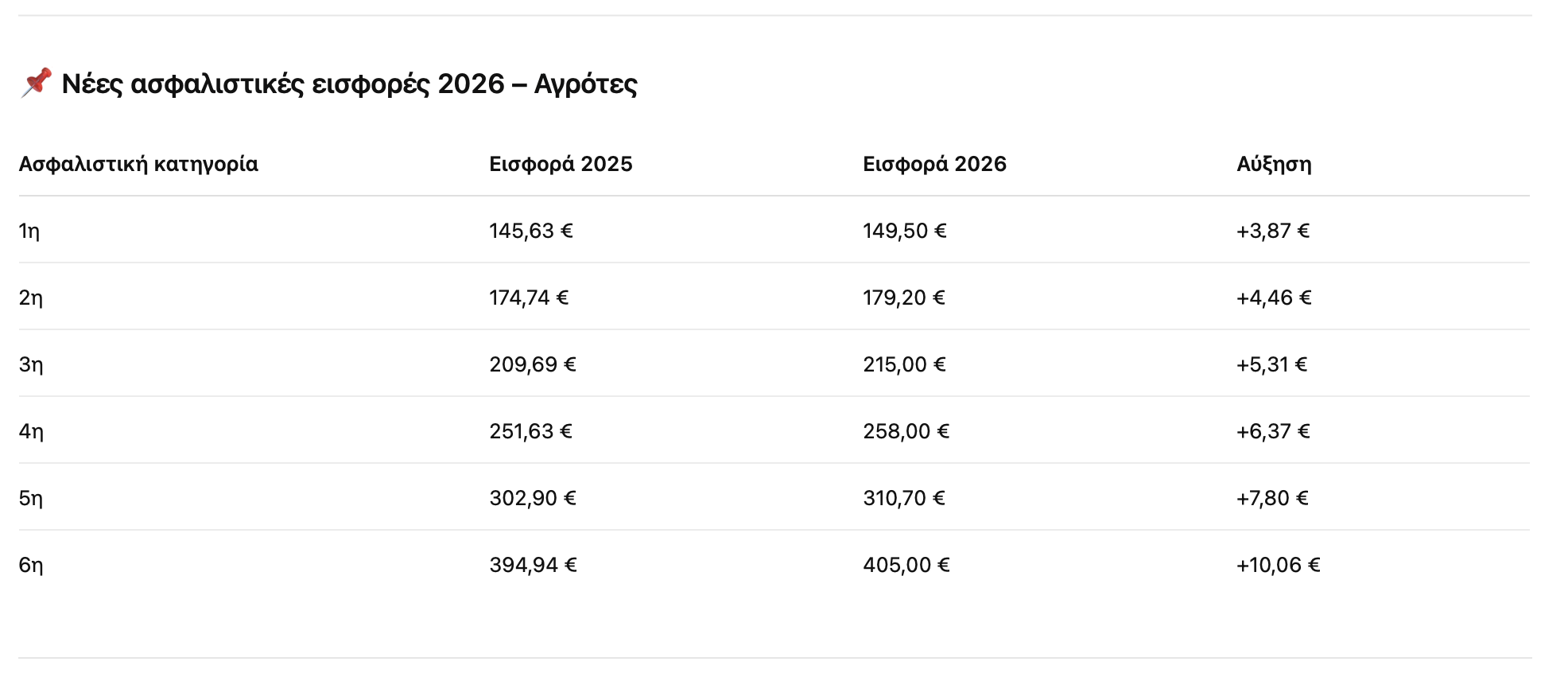 Για τους αγρότες, οι αυξήσεις κυμαίνονται από 3,8 ευρώ έως 10 ευρώ τον μήνα, ανάλογα με την ασφαλιστική κατηγορία.