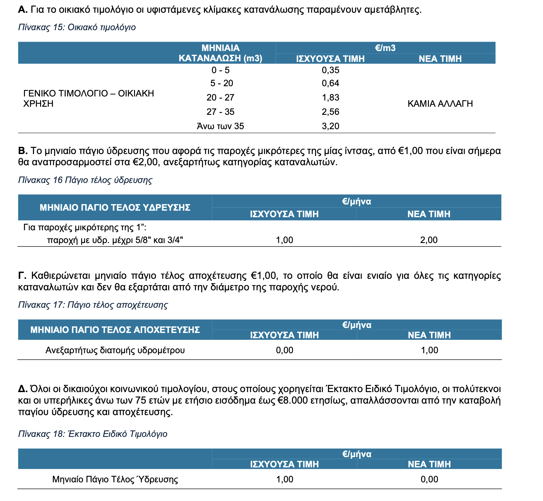 Μηνιαίο πάγιο: Το πάγιο για τις οικιακές παροχές πρόκειται να αυξηθεί από 1 ευρώ σε περίπου 2 ευρώ ανά μήνα. Επιπλέον, θα εισαχθεί νέο πάγιο για την αποχέτευση περίπου 1 ευρώ/μήνα για όλους τους χρήστες.