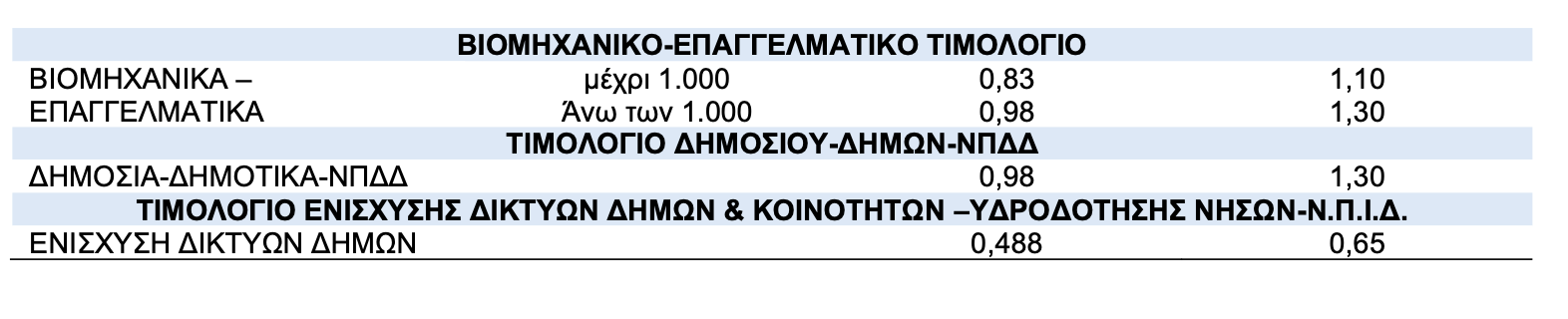 Επαγγελματικό/Βιομηχανικό τιμολόγιο: Οι επιχειρήσεις και οι επαγγελματίες θα δουν μεγαλύτερες αυξήσεις στις τιμές ανά κυβικό νερό — για παράδειγμα, από 0,83 ευρώ σε περίπου 1,10 ευρώ για κατανάλωση έως 1.000 m³ και από 0,98 σε 1,30 ευρώ για μεγαλύτερες ποσότητες.
