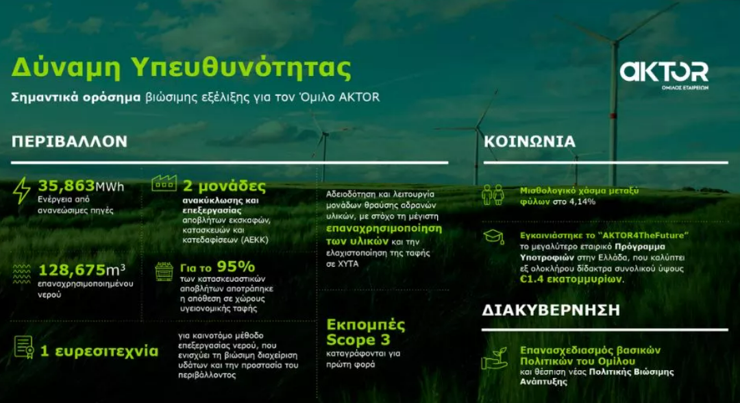 Την στρατηγική του αυτή τοποθέτηση επιβεβαιώνει η Έκθεση Βιωσιμότητας του Ομίλου AKTOR για το οικονομικό έτος 2024, η οποία είναι η πρώτη στην ιστορία του Ομίλου που είναι πλήρως εναρμονισμένη με τις ευρωπαϊκές οδηγίες CSRD και τα πρότυπα ESRS και, μάλιστα, ενσωματώνει την ΑΚΤΩΡ ΑΤΕ, την οποία εξαγόρασε στα τέλη του 2023.