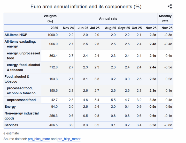 Στην Ευρωζώνη, η άνοδος του πληθωρισμού τον Νοέμβριο αποδίδεται κυρίως στις υπηρεσίες, όπου οι τιμές αυξήθηκαν με ετήσιο ρυθμό 3,5% έναντι 3,4% τον Οκτώβριο.