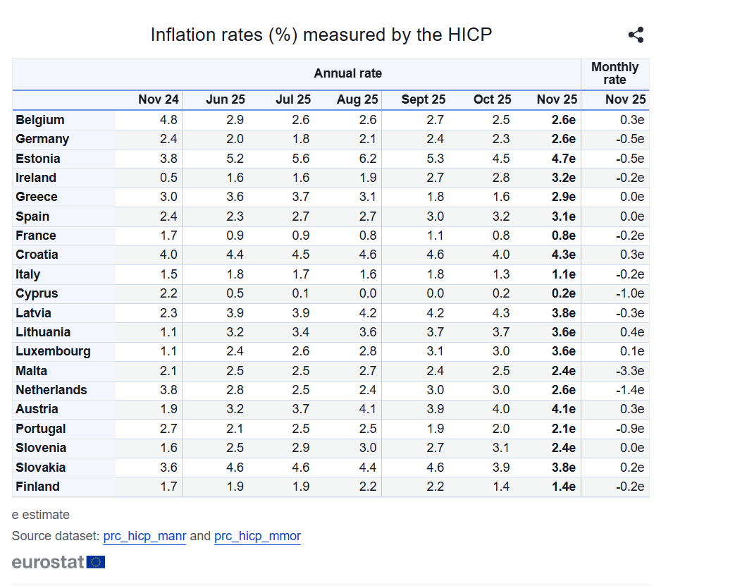 Η εικόνα στις μεγαλύτερες οικονομίες της Ευρώπης καταγράφει επίσης αυξητικές τάσεις. Στη Γαλλία ο πληθωρισμός εκτιμάται ότι διαμορφώθηκε στο 0,8%, σε ένα από τα χαμηλότερα επίπεδα μεταξύ των κρατών–μελών, ενώ στη Γερμανία τα προσωρινά στοιχεία έδειξαν άνοδο του εναρμονισμένου δείκτη στο 2,6% για τον Νοέμβριο, ενώ η ομοσπονδιακή στατιστική υπηρεσία της Γερμανίας ανακοίνωσε σήμερα ΄ότι ο πληθωρισμός επιβραδύνθηκε ελαφρώς τον Οκτώβριο, στο 2,3%