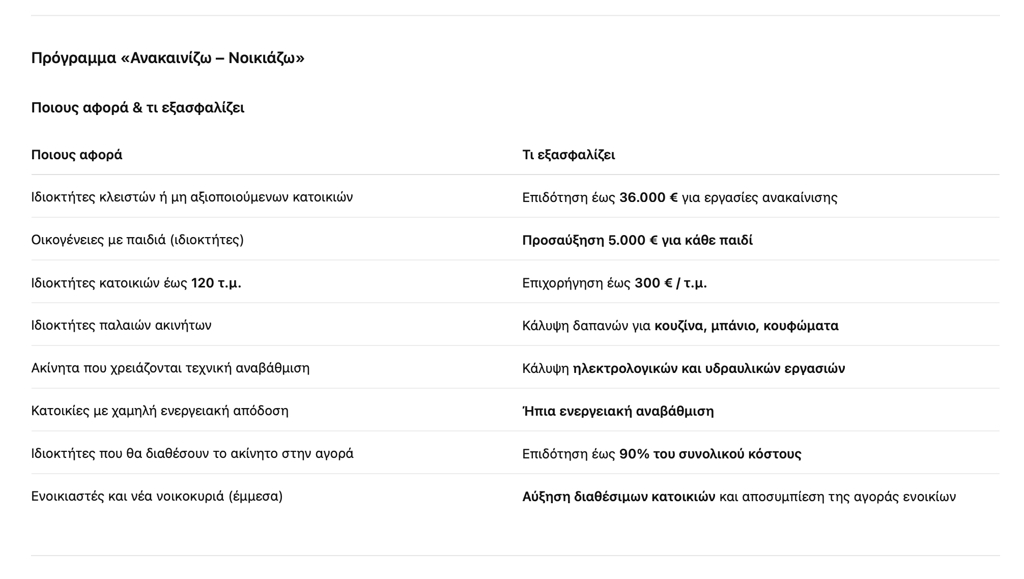 Το πρόγραμμα διευρύνεται σημαντικά και προβλέπει επιδότηση έως 36.000 ευρώ ανά ακίνητο, με προσαύξηση 5.000 ευρώ για κάθε παιδί, ενώ το ποσοστό ενίσχυσης μπορεί να φτάσει έως και το 90% του συνολικού κόστους των εργασιών. Η φιλοσοφία του μέτρου είναι σαφής: λιγότερα κλειστά σπίτια, περισσότερες διαθέσιμες κατοικίες και μεγαλύτερη ανακούφιση για ενοικιαστές και οικογένειες που αναζητούν στέγη.