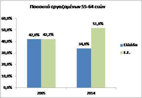 4)Το κύμα πρόωρων συνταξιοδοτήσεων της τελευταίας 5ετίας, υπό το φόβο χειροτέρευσης της οικονομικής κατάστασης. Το 51% των ανθρώπων που βγήκαν στη σύνταξη από το 2010 και μετά ήταν κάτω των 61 ετών. Πλέον στην Ελλάδα εργάζεται μόλις το 34% των ανθρώπων ηλικίας 55-64 ετών, την ίδια ώρα που ο αντίστοιχος μέσος όρος της Ε.Ε. είναι 52%. Μάλιστα, όπως φαίνεται και στο παρακάτω γράφημα, ενώ στην υπόλοιπη Ευρώπη την τελευταία δεκαετία έλαβαν μέτρα περιορισμού των πρόωρων συνταξιοδοτήσεων αυξάνοντας το ποσοστό των εργαζομένων, στην Ελλάδα συνέβη το ακριβώς αντίθετο!
