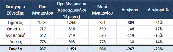 Σε σύγκριση με την προ μνημονίου εποχή, οι συντάξεις έχουν μειωθεί κατά μέσο όρο 23%. (Η εξοικονόμηση ήταν της τάξης των €7,5 δις ετησίως).