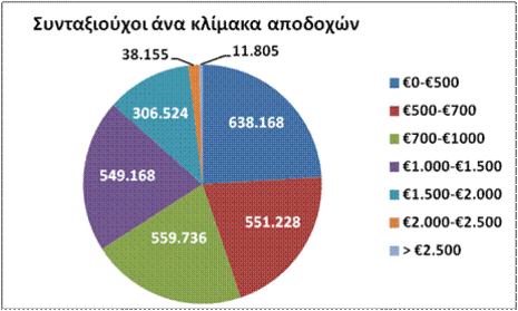 Όπως φαίνεται και στο παρακάτω γράφημα, τα 2/3 των συνταξιούχων (€1,75 εκ) λαμβάνουν συνταξιοδοτικές αποδοχές έως €1,000, ενώ το 45% έως €700.
