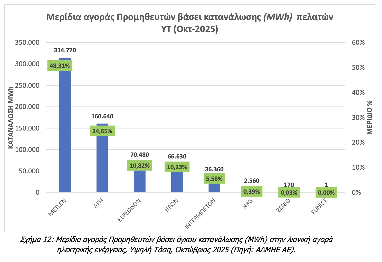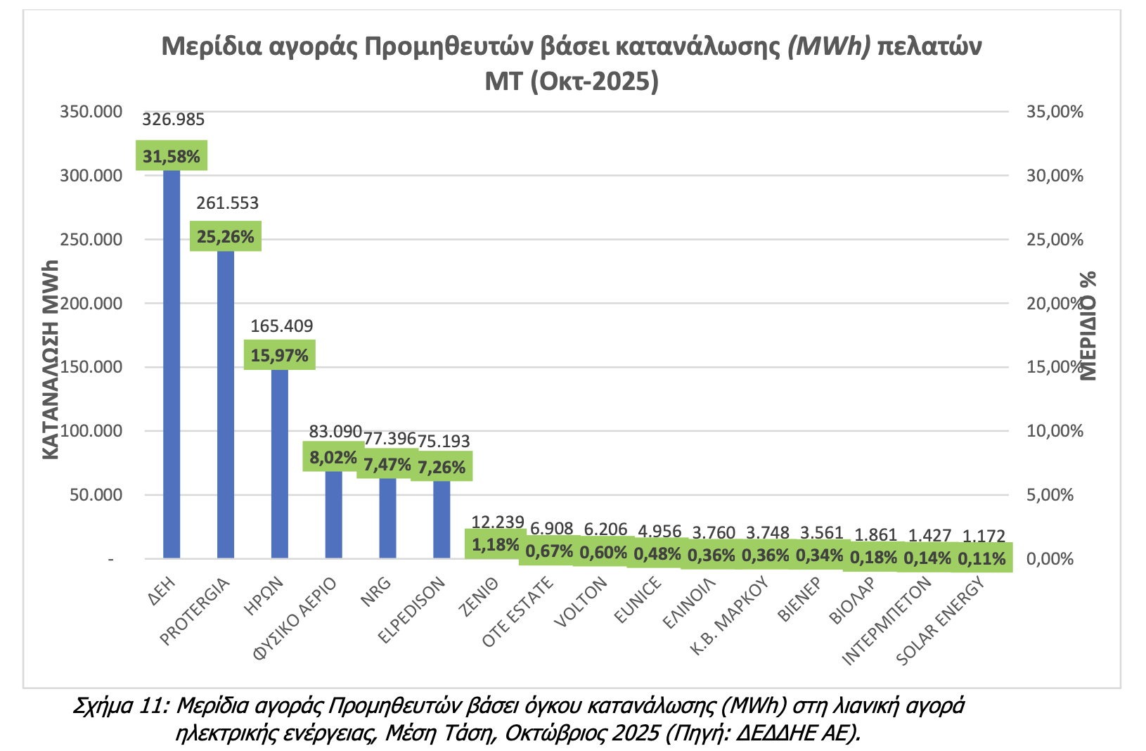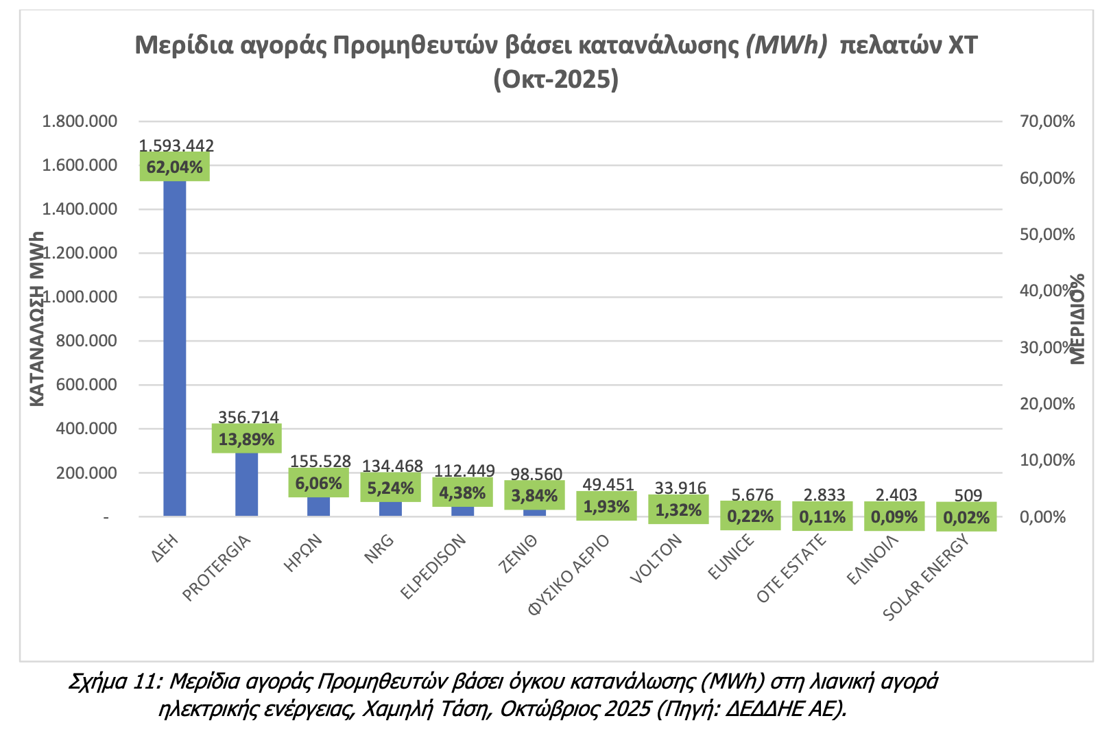 Σύμφωνα με την Έκκθεση, τον Οκτώβριο δραστηριοποιήθηκαν 22 προμηθευτές στη λιανική αγορά, μαζί με τους 5 Προμηθευτές Καθολικής Υπηρεσίας. Παρότι ο αριθμός των προμηθευτών είναι μεγάλος, η αγορά εμφανίζει υψηλή συγκέντρωση: