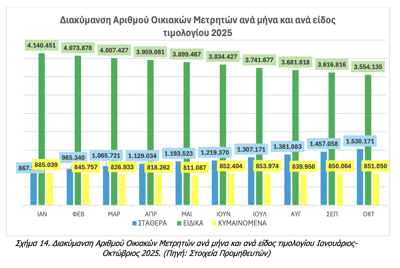 Με άλλα λόγια είχαμε 663.010 επιπλέον οικιακούς μετρητές σε σταθερά τιμολόγια από Ιανουάριο σε Οκτώβριο, που αποτελεί μια αύξηση περίπου 76,5% μέσα σε δέκα μήνες.