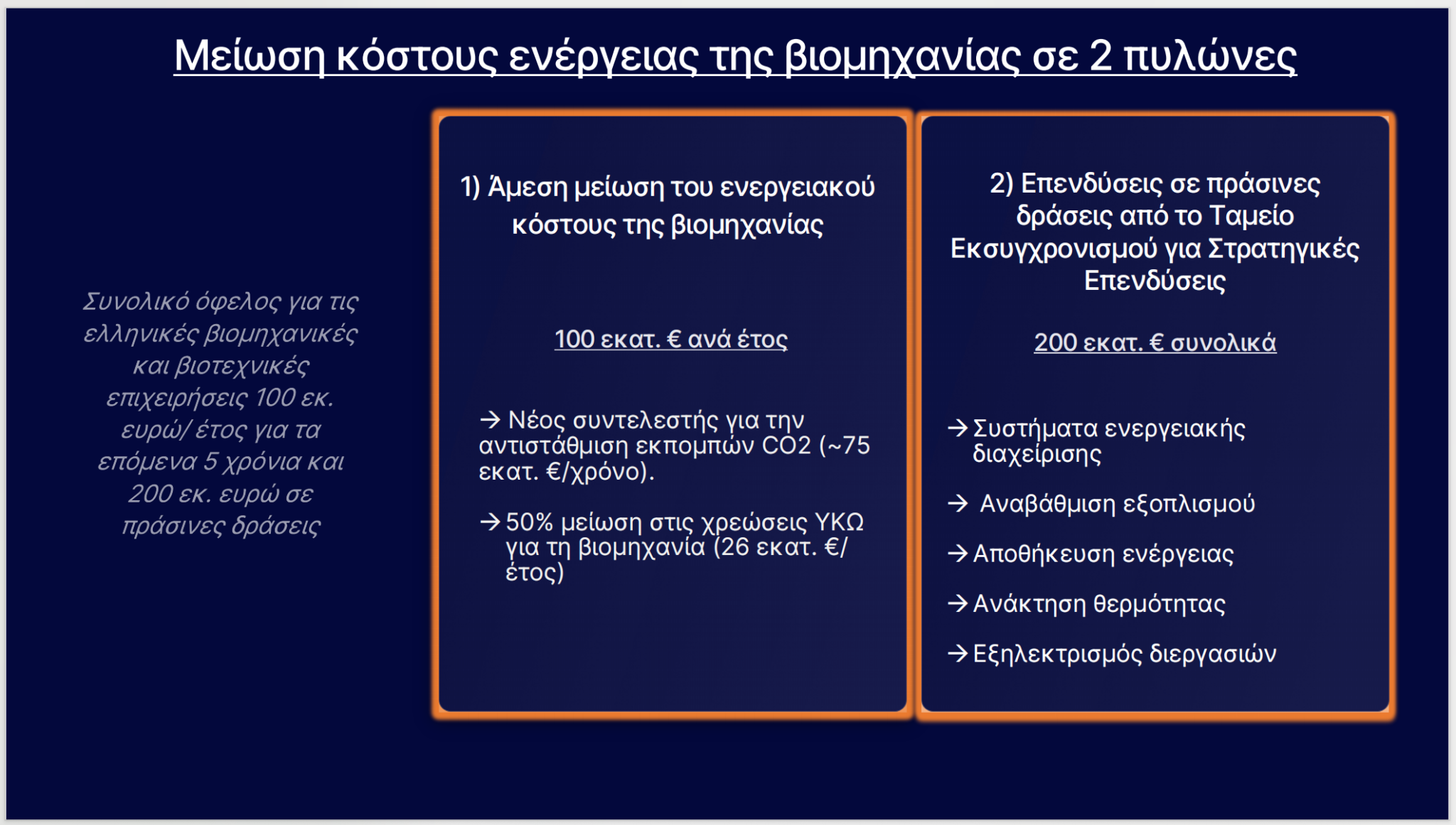 α) άμεση μείωση του ενεργειακού κόστους της βιομηχανίας, με όφελος που υπολογίζεται σε περίπου 100 εκατ. ευρώ ετησίως, και