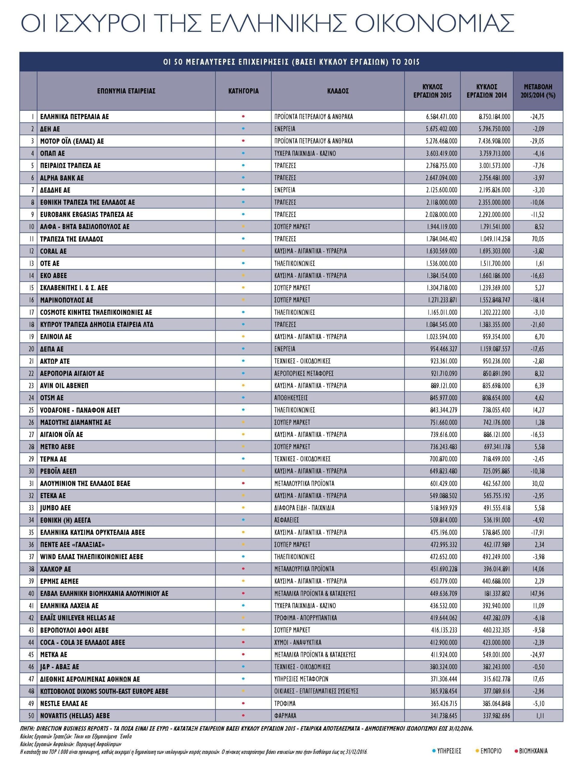 Ισχυροί κλάδοι με τον μεγαλύτερο κύκλο εργασιών το 2015 αναδείχθηκαν οι: τράπεζες (10 εταιρείες) με 12,72 δισ. ευρώ, ο βιομηχανικός κλάδος των πετρελαιοειδών-διυλιστήρια (3 εταιρείες) με 11,89 δισ. ευρώ, ο κλάδος της ενέργειας (21 εταιρείες) με 10,59 δισ. ευρώ, ο εμπορικός κλάδος των πετρελαιοειδών (22 εταιρείες) με 9,73 δισ. ευρώ, τα σούπερ μάρκετ (36 εταιρείες) με 8,84 δισ. ευρώ, ο βιομηχανικός κλάδος των τροφίμων (121 εταιρείες) με 7,22 δισ. ευρώ, οι τηλεπικοινωνίες (10 εταιρείες) με 4,71 δισ. ευρώ, ο εμπορικός κλάδος των φαρμάκων (φάρμακα και φαρμακαποθήκες) με 66 εταιρείες και συνολικό κύκλο εργασιών 4,13 δισ. ευρώ, τα τυχερά παιχνίδια-καζίνο (3 εταιρείες) με 4,06 δισ. ευρώ, οι τεχνικές-οικοδομικές (33 εταιρείες) με 3,51 δισ. ευρώ και οι ασφάλειες (29 εταιρείες) με 3,41 δισ. ευρώ.