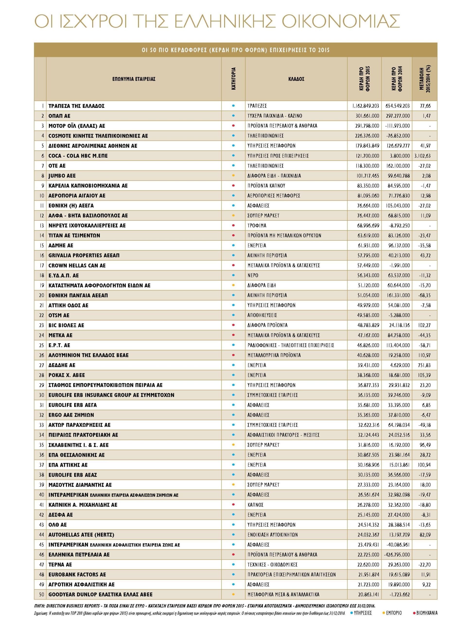 Από το σύνολο των υπό εξέταση εταιρειών το 71,53% (196 εταιρείες) σημείωσαν κερδοφορία (κέρδη προ φόρων) το 2015. Ισχυροί κλάδοι με τον μεγαλύτερο κύκλο εργασιών το 2015 αναδείχθηκαν οι εξής: οι τράπεζες (10 εταιρείες) με 12,72 δισ. ευρώ, ο κλάδος της ενέργειας (21 εταιρείες) με 10,59 δισ. ευρώ, οι τηλεπικοινωνίες (10 εταιρείες) με 4,71 δισ. ευρώ, τα τυχερά παιχνίδια-καζίνο (3 εταιρείες) με 4,06 δισ. ευρώ, οι τεχνικές-οικοδομικές (33 εταιρείες) με 3,51 δισ. ευρώ και οι ασφάλειες (29 εταιρείες) με 3,41 δισ. ευρώ.