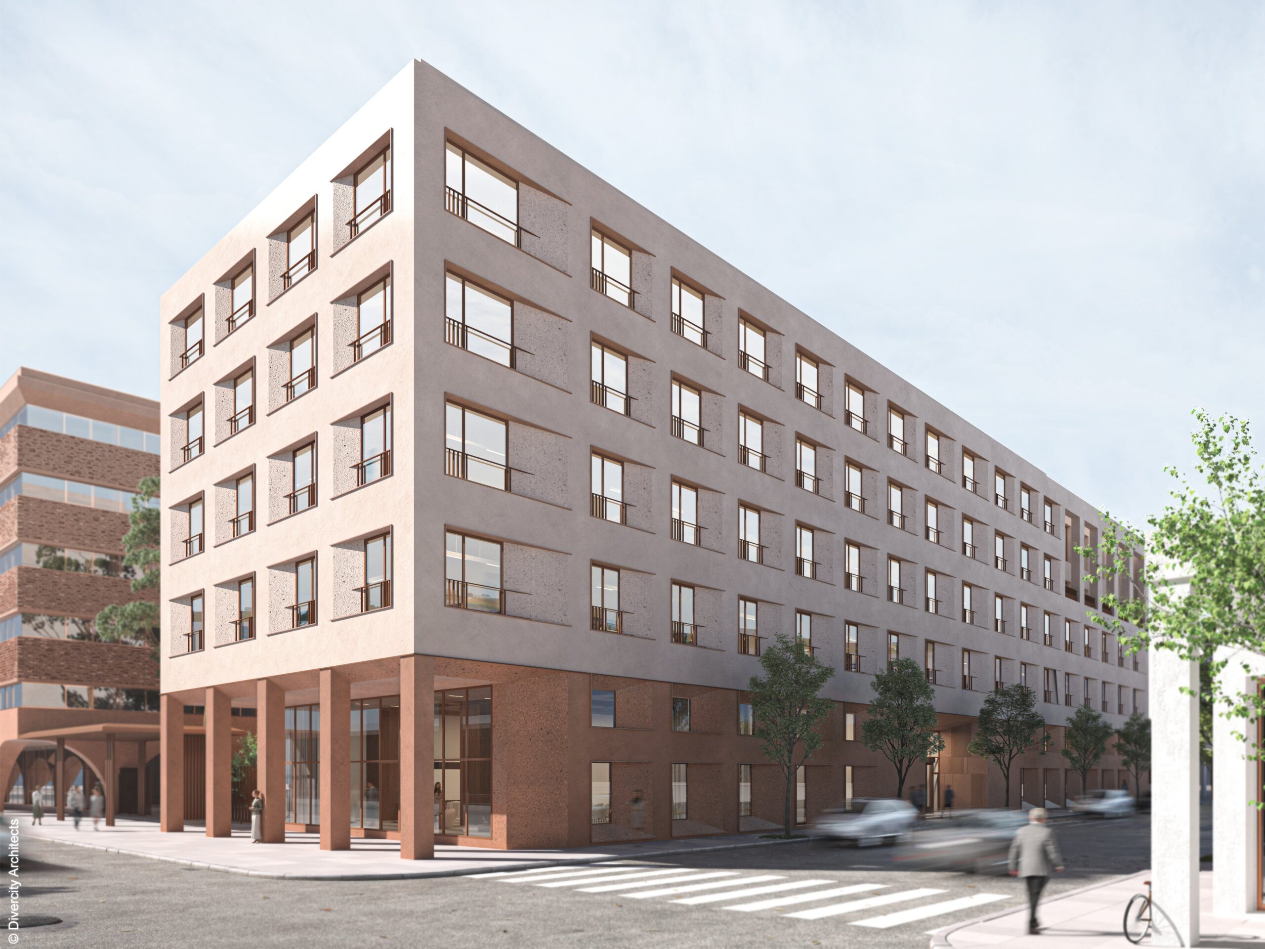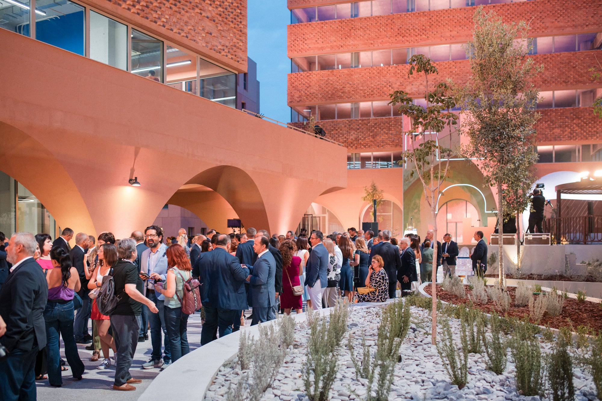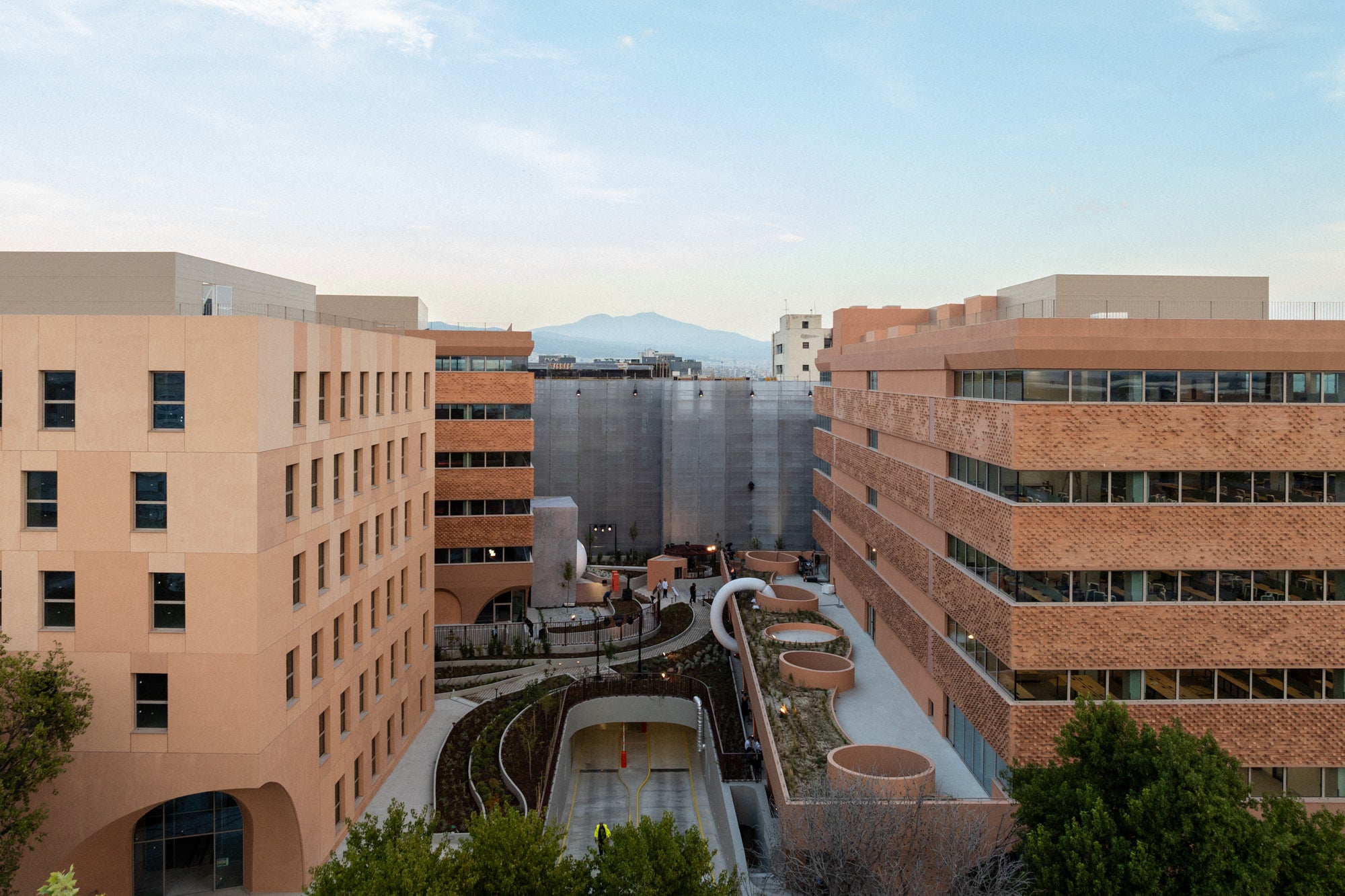Tα κτήρια πλαισιώνουν μια κεντρική πλατεία, έναν καταπράσινο υπαίθριο χώρο, που γίνεται αφορμή για επαφή και συνύπαρξη, συμβάλλοντας στην υγεία και ευεξία των εργαζομένων του συγκροτήματος.