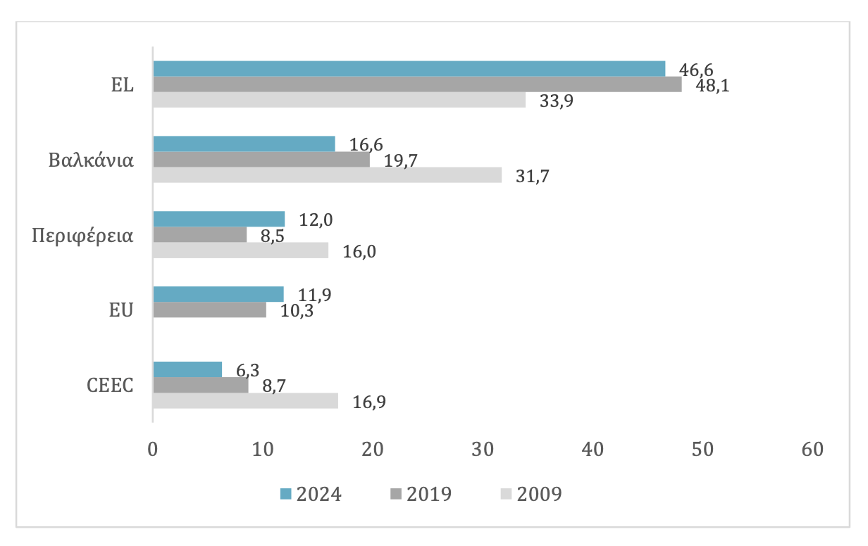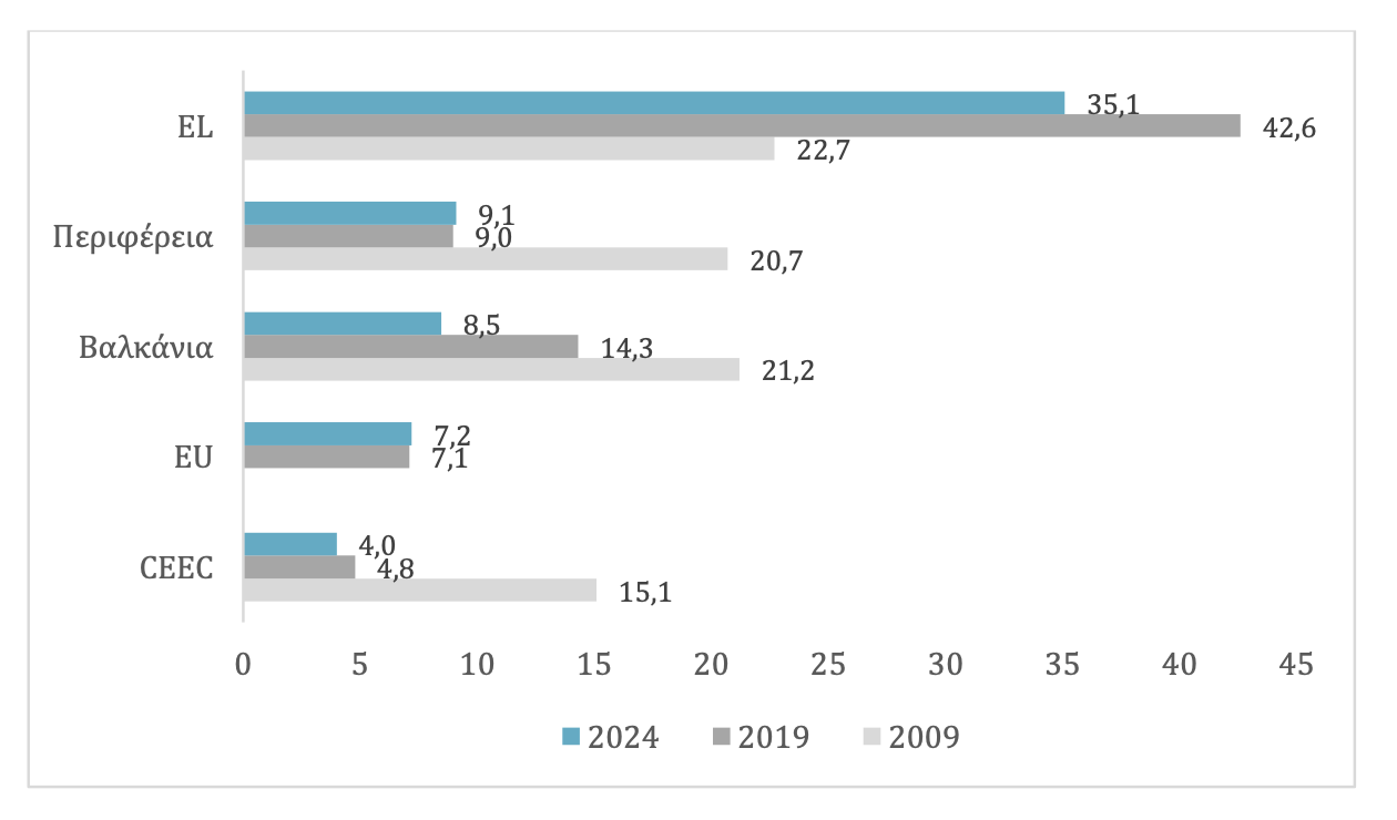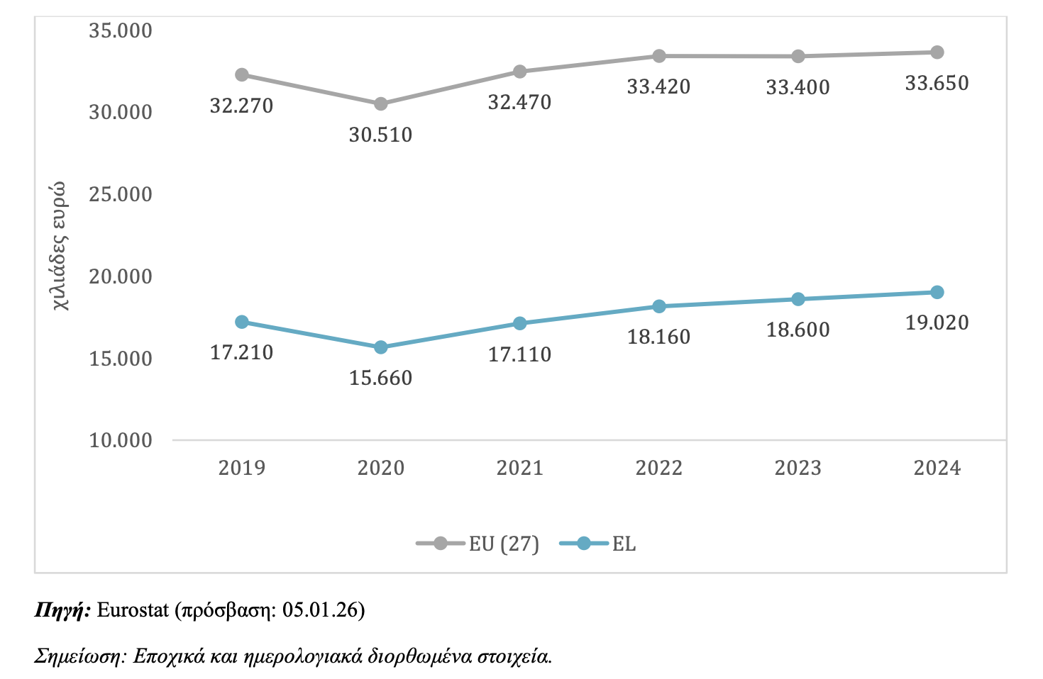 Η απόσταση στο βιοτικό επίπεδο παραμένει τεράστια. Το πραγματικό κατά κεφαλήν ΑΕΠ στην Ελλάδα ήταν το 2019 περίπου 17.200 ευρώ, έναντι 32.270 ευρώ στην ΕΕ. Το 2024, παρά την ανάκαμψη της οικονομίας, η διαφορά παραμένει σχεδόν ίδια, γύρω στις 14.600 ευρώ.