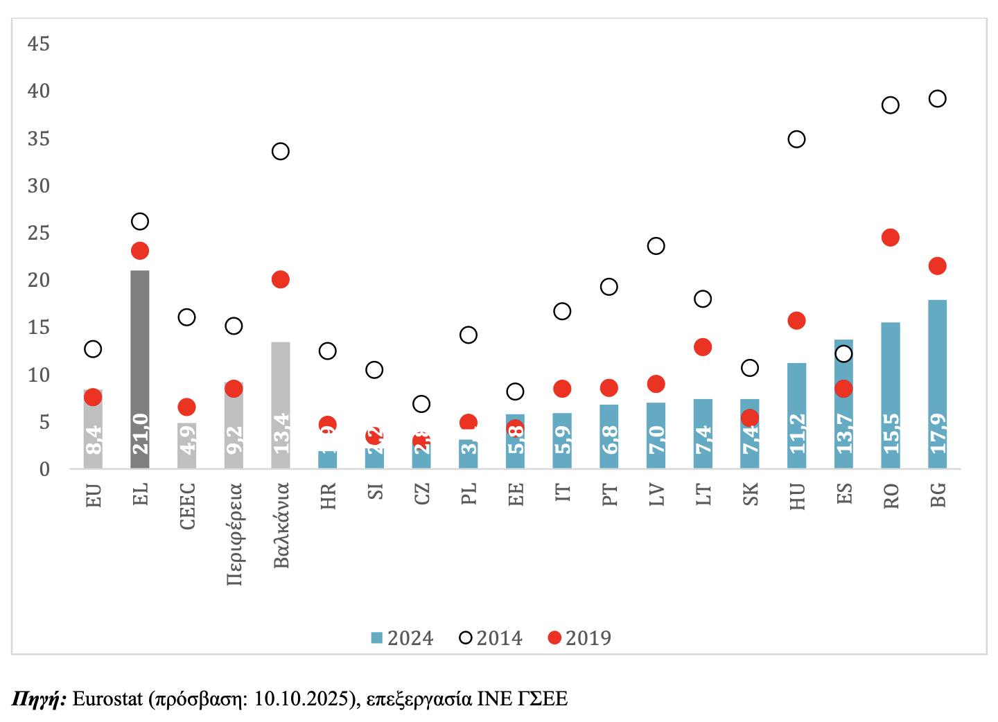 Η ανεργία έχει μειωθεί, αλλά η Ελλάδα εξακολουθεί να έχει χαμηλότερο ποσοστό απασχόλησης από την ΕΕ και από πολλές χώρες της Ανατολικής Ευρώπης. Παράλληλα, η υποαπασχόληση παραμένει υψηλή.
