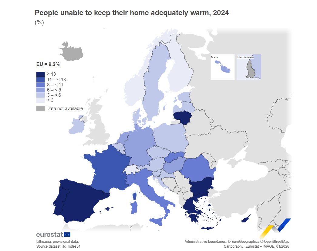 Σύμφωνα με τα στοιχεία για το 2024, συνολικά το 9,2% του πληθυσμού της ΕΕ δεν ήταν σε θέση να διατηρήσει επαρκή θερμοκρασία στην κατοικία του. Σε σύγκριση με το 2023, αυτό συνιστά βελτίωση κατά 1,4 ποσοστιαίες μονάδες, ένδειξη αποκλιμάκωσης της πίεσης στα ευρωπαϊκά νοικοκυριά, χωρίς ωστόσο να αναιρείται η ένταση του προβλήματος σε ορισμένα κράτη-μέλη.