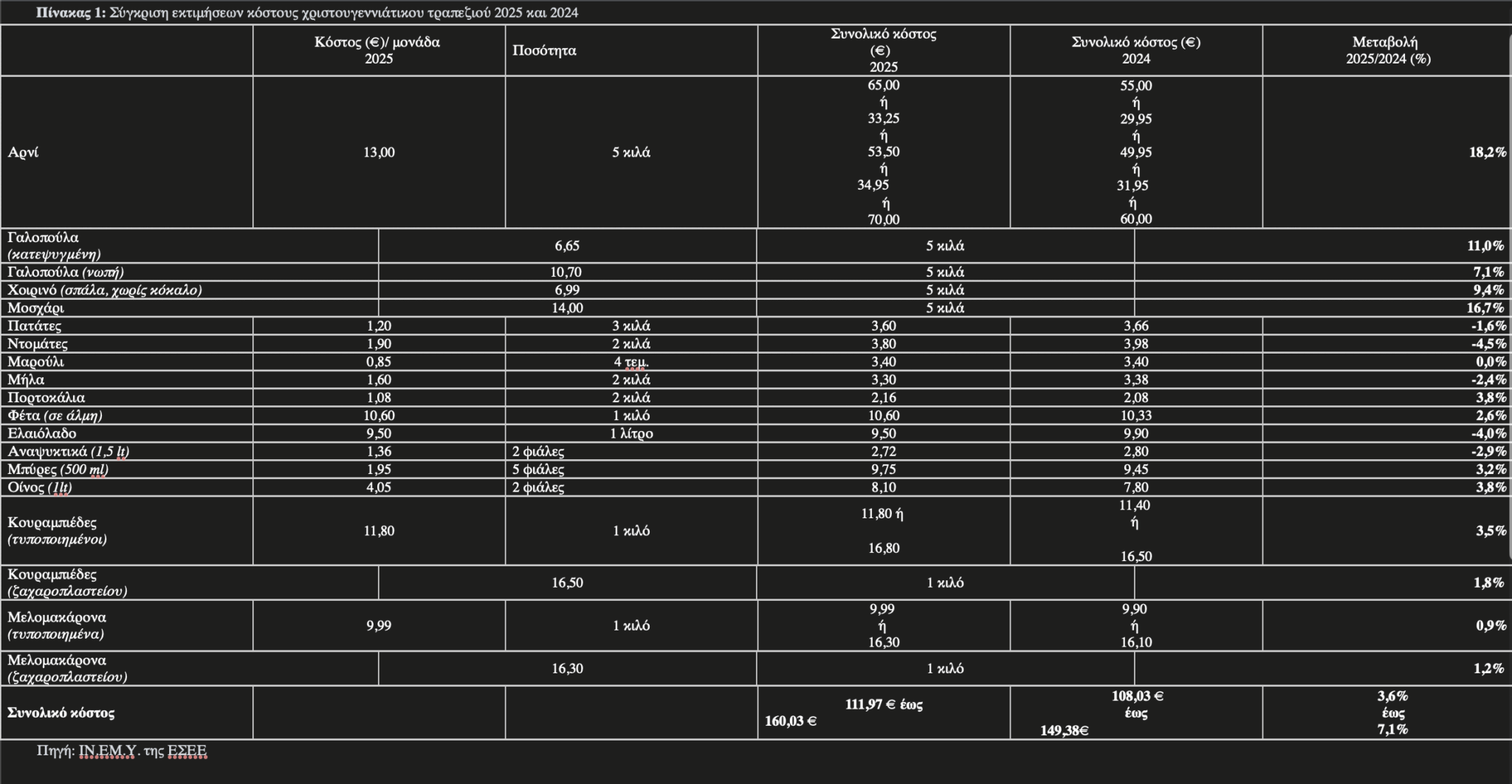 Από 111,97 έως 160,03 ευρώ, θα κοστίσει το φετινό χριστουγεννιάτικο τραπέζι (6-8 ατόμων) σύμφωνα με την εκτίμηση του Ινστιτούτου Εμπορίου και Υπηρεσιών της Ελληνικής Συνομοσπονδίας Εμπορίου και Επιχειρηματικότητας (ΙΝ.ΕΜ.Υ.-ΕΣΕΕ).