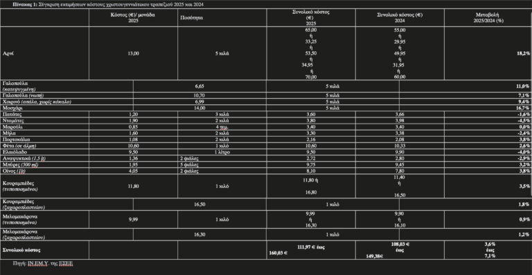 Όπως αναφέρει σε ανακοίνωση της η ΕΣΕΕ, πρόκειται για μεταβολή της τάξης του 3,6% έως 7,1% σε σύγκριση με το αντίστοιχο τραπέζι του 2024.
