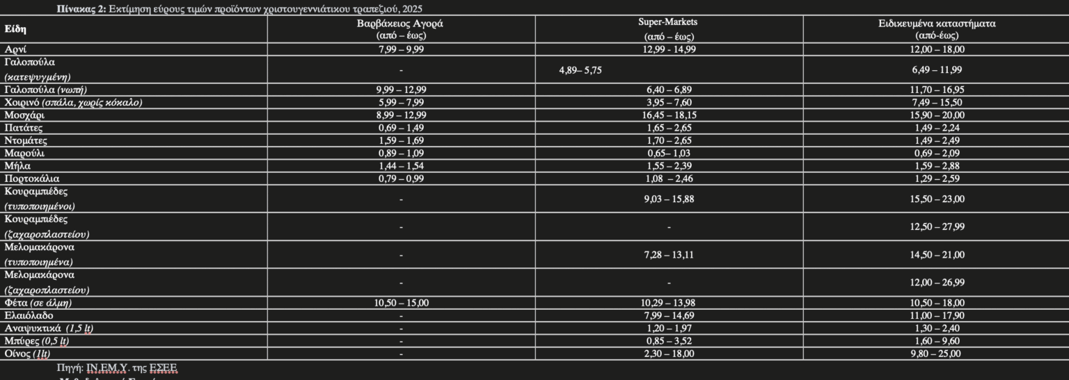 Το ΙΝ.ΕΜ.Υ. της ΕΣΕΕ πραγματοποίησε, κατά το διάστημα 15-17 Δεκεμβρίου 2025, ενδεικτική καταγραφή των τιμών πώλησης των προϊόντων του χριστουγεννιάτικου τραπεζιού, με τη μέθοδο της επιτόπιας παρατήρησης σε εμπορικές αγορές της Αττικής και διαμέσου τηλεφωνικής συνέντευξης για τη Θεσσαλονίκη.