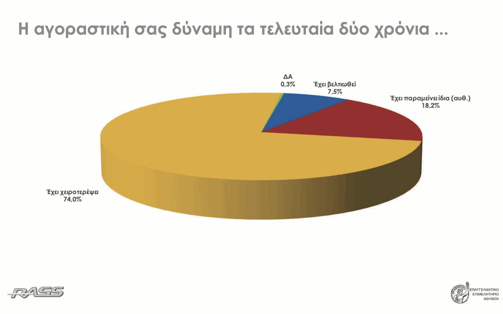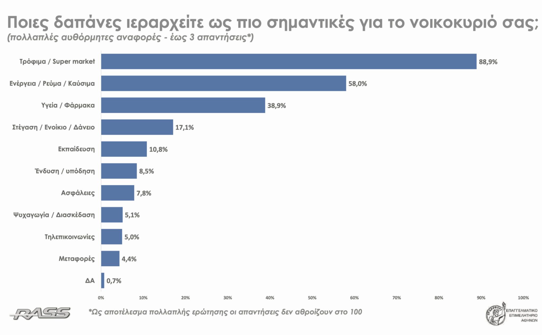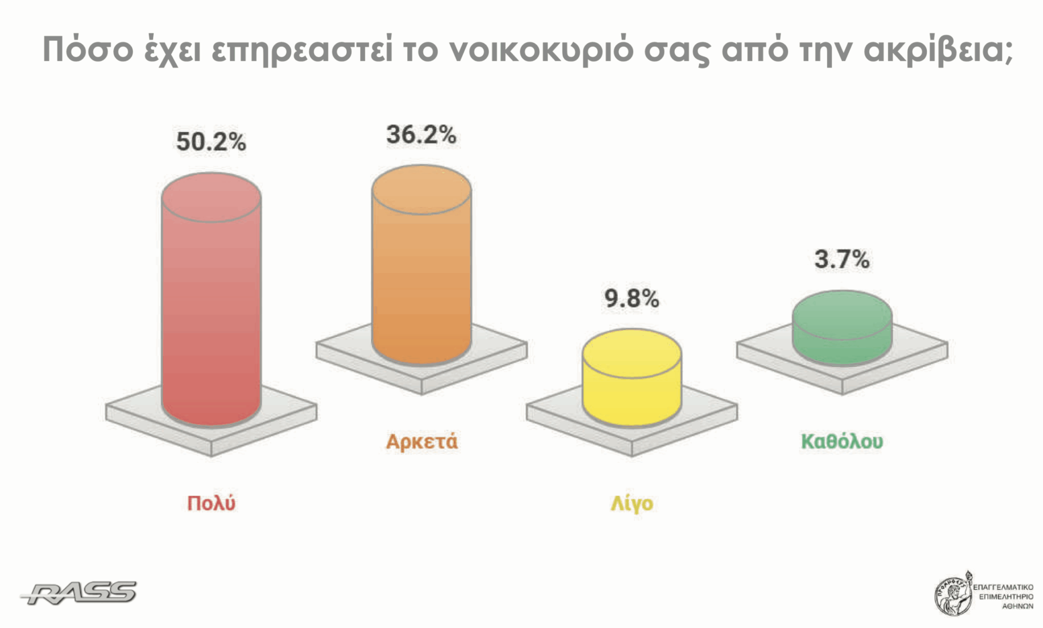 Η έρευνα γνώμης καταναλωτών της εταιρείας RASS για λογαριασμό του Επαγγελματικού Επιμελητηρίου Αθηνών (ΕΕΑ) επιβεβαιώνει με σαφήνεια ότι η ακρίβεια έχει μετατραπεί σε καθολικό κοινωνικό και οικονομικό πρόβλημα για τα ελληνικά νοικοκυριά.
