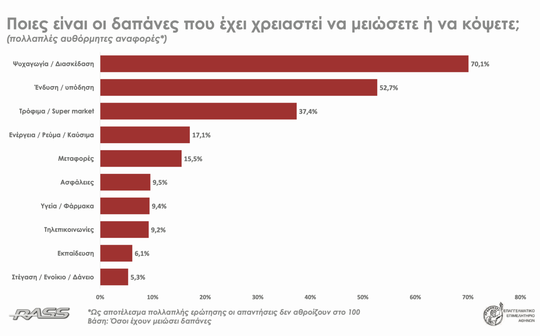 Η πίεση που νιώθουν τα νοικοκυριά αντανακλάται σε πρακτικές επιλογές: Περίπου 8 στους 10 έχουν μειώσει τις δαπάνες τους, ακόμη και σε βασικά αγαθά όπως τρόφιμα, ενέργεια και υπηρεσίες υγείας — αντικατοπτρίζοντας μια συρρίκνωση της κατανάλωσης που μπορεί να επιβραδύνει περαιτέρω την οικονομική δραστηριότητα.