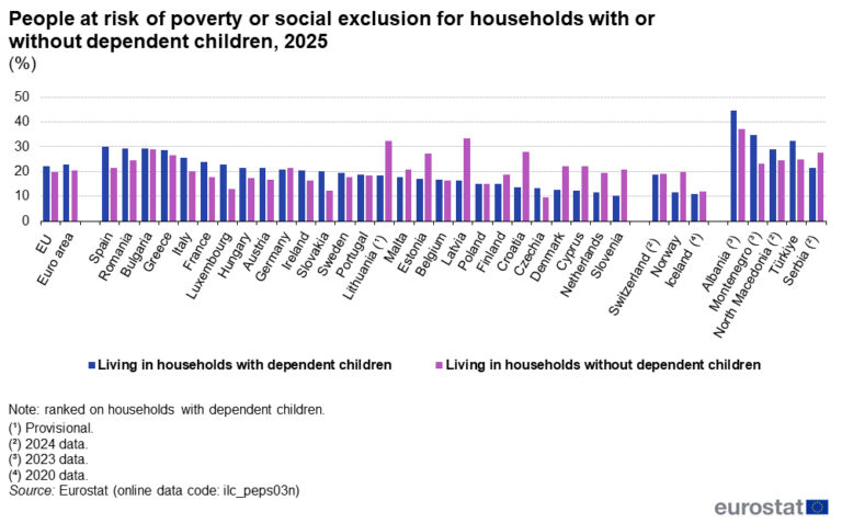 Σε επίπεδο ΕΕ, 92,7 εκατομμύρια άνθρωποι – δηλαδή το 20,9% του συνολικού πληθυσμού – βρίσκονταν σε κίνδυνο φτώχειας ή κοινωνικού αποκλεισμού (δείκτης AROPE). Πρόκειται για άτομα που ζουν σε νοικοκυριά τα οποία αντιμετωπίζουν τουλάχιστον έναν από τους τρεις σχετικούς κινδύνους: κίνδυνο φτώχειας, σοβαρή υλική και κοινωνική στέρηση ή πολύ χαμηλή ένταση εργασίας. Σε σύγκριση με το 2024, ο αριθμός αυτός μειώθηκε κατά περίπου 600.000 άτομα (από 93,3 εκατομμύρια ή 21,0% του πληθυσμού).