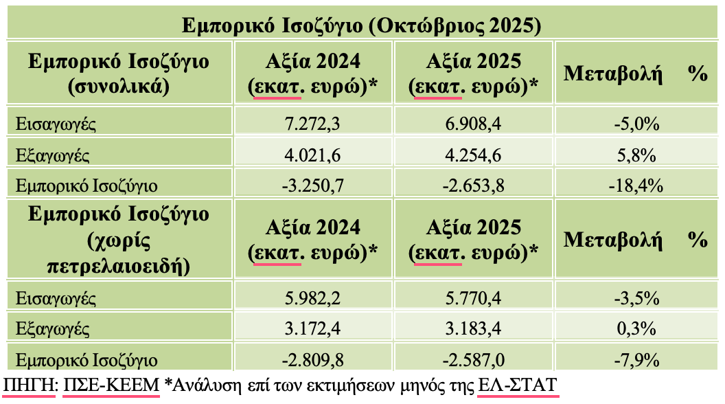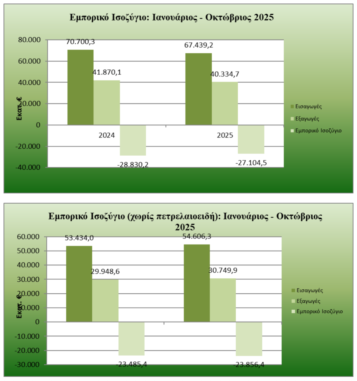 Στο δεκάμηνο Ιανουαρίου–Οκτωβρίου, η εικόνα είναι πιο σύνθετη. Συνολικά οι εξαγωγές μειώθηκαν κατά -3,7%, κυρίως λόγω της μεγάλης πτώσης στα πετρελαιοειδή. Όμως, χωρίς αυτά, οι εξαγωγές σημειώνουν άνοδο 2,7%, επιβεβαιώνοντας την ανθεκτικότητα της ελληνικής μεταποίησης και του αγροδιατροφικού τομέα. Παράλληλα, το εμπορικό έλλειμμα μειώθηκε κατά 6% συνολικά, ενώ χωρίς τα πετρελαιοειδή εμφανίζει μικρή αύξηση 1,6%