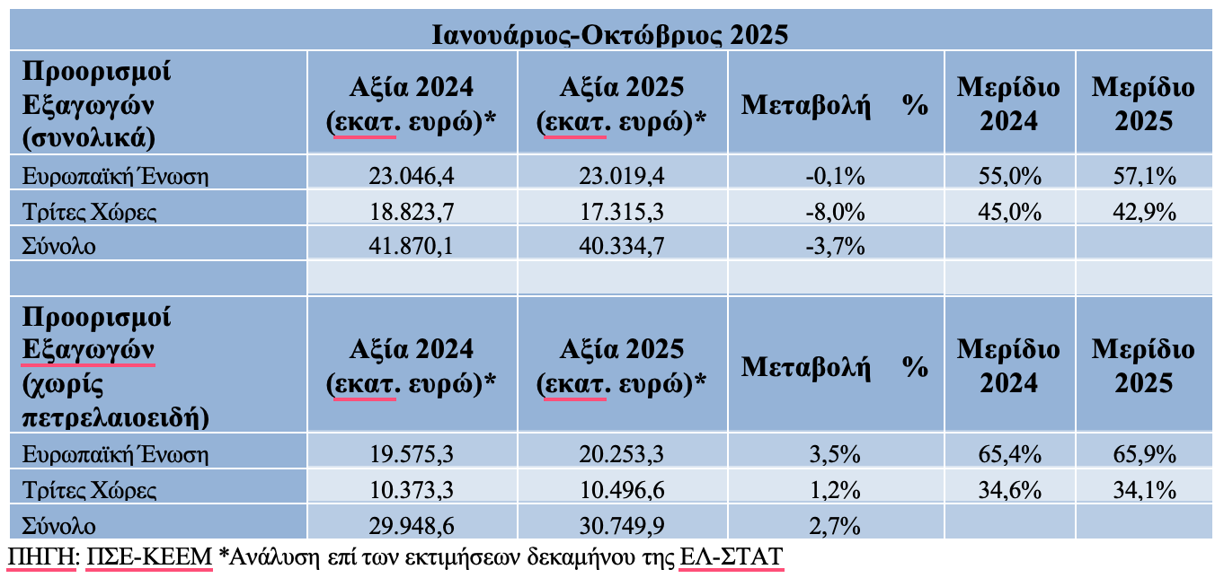 Σημαντικό επίσης στοιχείο είναι η γεωγραφική κατανομή των εξαγωγών. Η Ευρώπη παραμένει ο σταθερότερος προορισμός της ελληνικής παραγωγής: το 56,5% των συνολικών εξαγωγών του Οκτωβρίου κατευθύνθηκε προς κράτη-μέλη της ΕΕ, ποσοστό που ανεβαίνει στο 66,1% όταν εξαιρεθούν τα πετρελαιοειδή. Οι εξαγωγές προς Τρίτες Χώρες αυξήθηκαν συνολικά κατά 7,5%, αλλά χωρίς πετρελαιοειδή καταγράφουν πτώση -4,5%