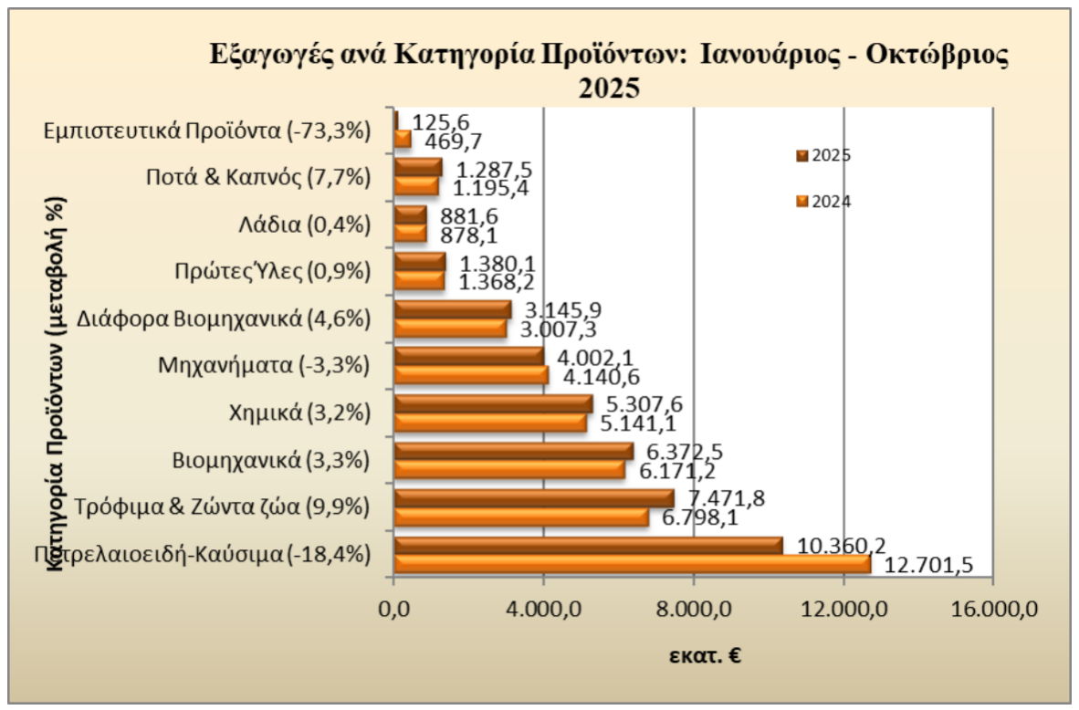 Η διαφοροποίηση μεταξύ των κλάδων είναι εμφανής. Επτά από τους δέκα βασικούς τομείς κινούνται θετικά στο δεκάμηνο, με τα Τρόφιμα να ξεχωρίζουν (+9,9%), ακολουθούμενα από τα Βιομηχανικά προϊόντα (+3,3%) και τα Χημικά (+3,2%) . Στον αντίποδα, σοβαρές πιέσεις καταγράφουν τα Πετρελαιοειδή-Καύσιμα, που υποχωρούν κατά -18,4%, τα Μηχανήματα (-3,3%) και η κατηγορία Εμπιστευτικών Προϊόντων, όπου η πτώση ξεπερνά το 70%.