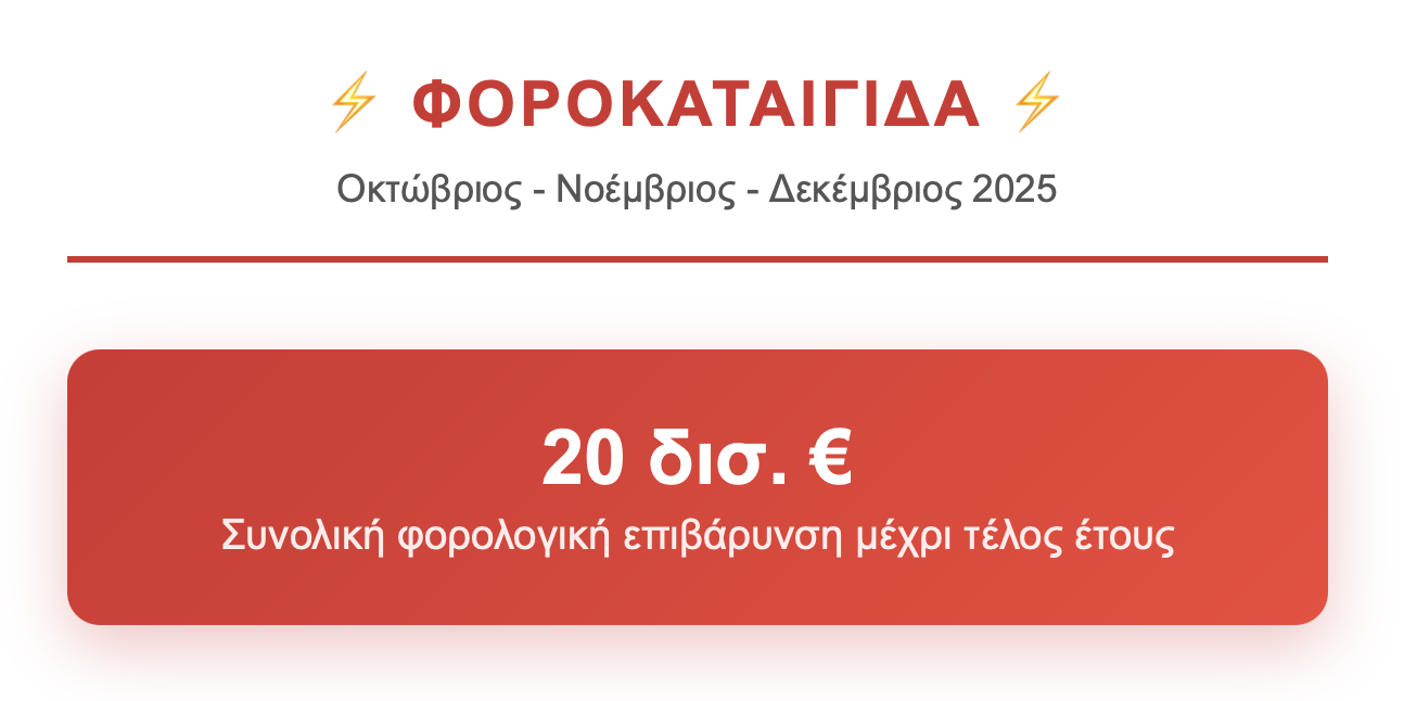 Μια πραγματική «φοροκαταιγίδα» ύψους 20 δισεκατομμυρίων ευρώ αναμένεται να πλήξει νοικοκυριά και επιχειρήσεις τους τελευταίους μήνες του έτους, καθώς η φορολογική πίεση κορυφώνεται με μια σειρά υποχρεώσεων που θα πρέπει να εξοφληθούν έως το τέλος Δεκεμβρίου.