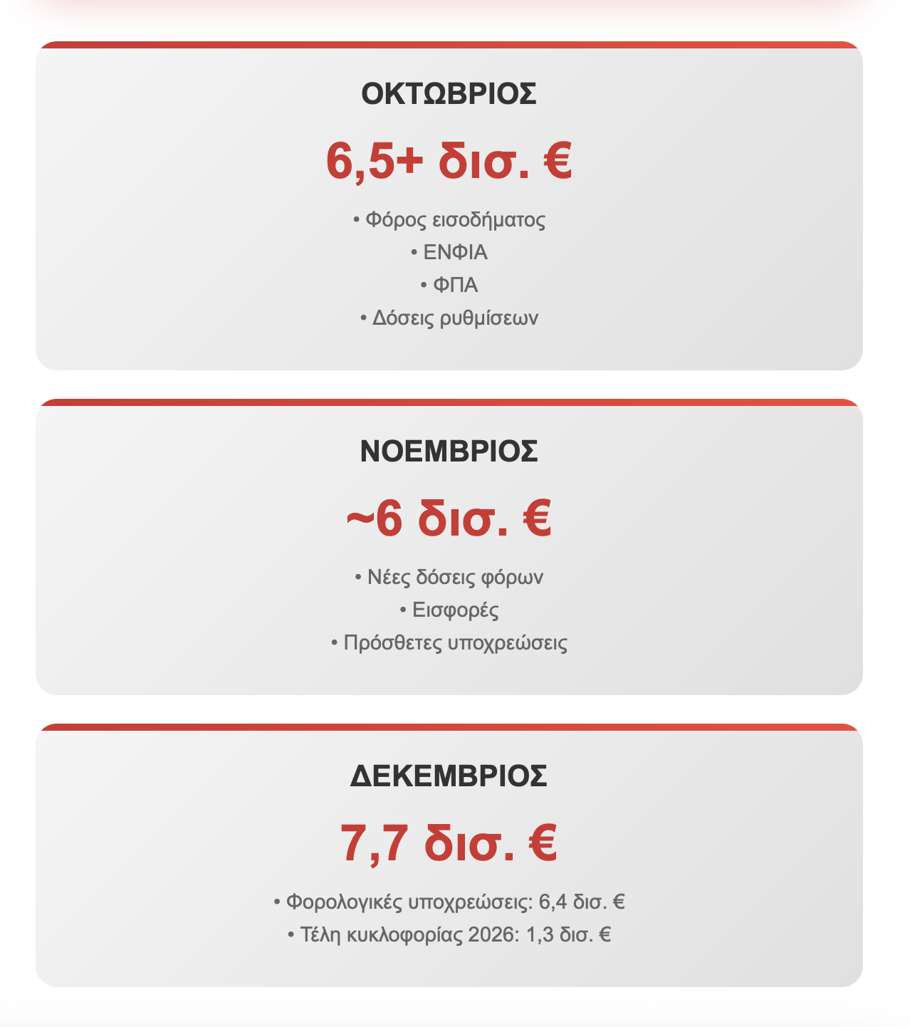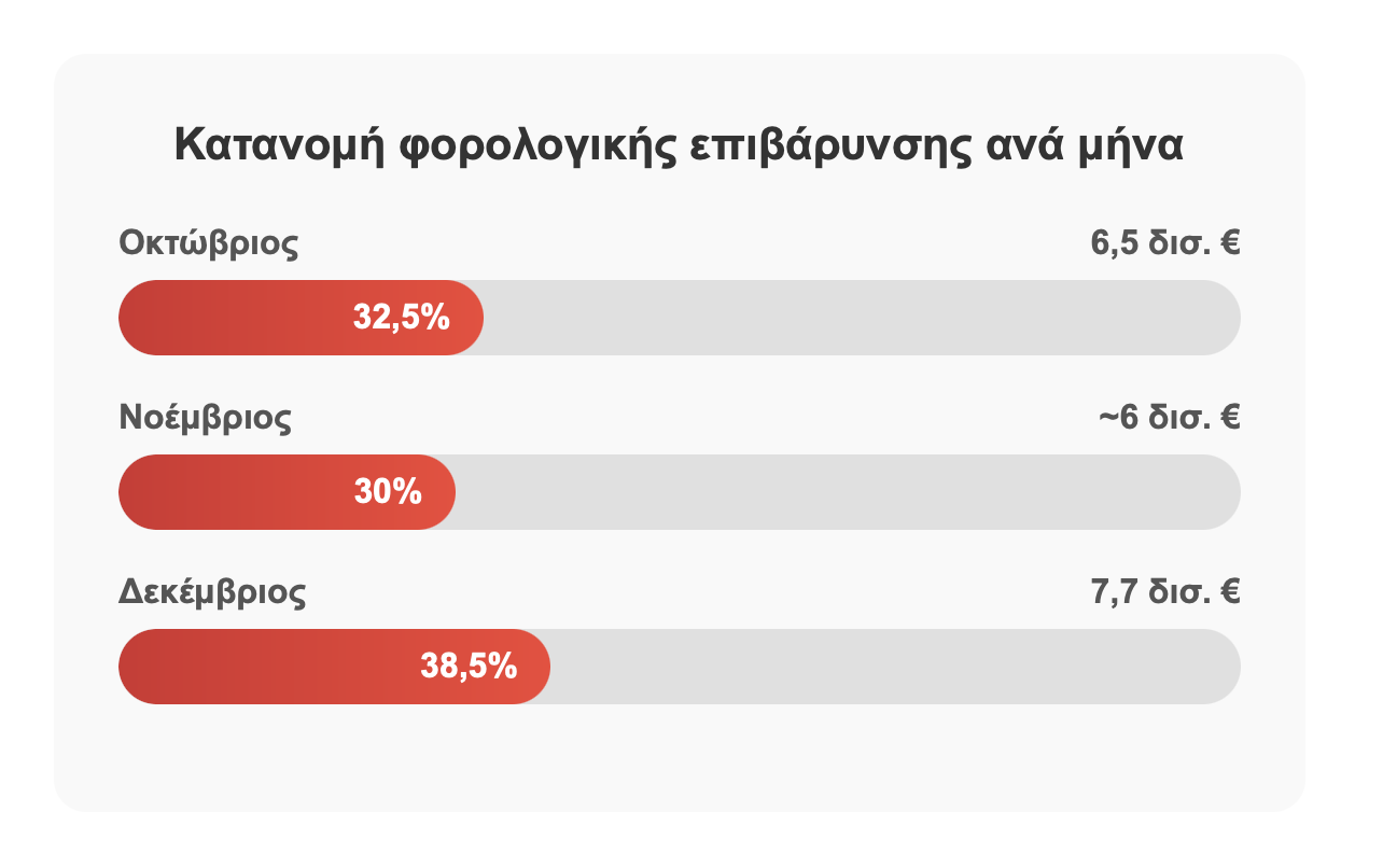 Το βάρος μοιράζεται σε τρεις «δόσεις» — Οκτώβριο, Νοέμβριο και Δεκέμβριο — με κάθε μήνα να φέρνει νέο κύμα πληρωμών. Τον Οκτώβριο, το Δημόσιο υπολογίζει έσοδα άνω των 6,5 δισ. ευρώ από φόρο εισοδήματος, ΕΝΦΙΑ, ΦΠΑ και δόσεις ρυθμίσεων. Τον Νοέμβριο η φορολογική επιβάρυνση αυξάνεται με νέες δόσεις φόρων και εισφορών, ενώ ο Δεκέμβριος παραδοσιακά αποτελεί τον πιο «βαρύ» μήνα, με πρόσθετα 6,4 δισ. ευρώ να πρέπει να καταβληθούν — μαζί με τα τέλη κυκλοφορίας του 2026, συνολικού ύψους άνω του 1,3 δισ. ευρώ.