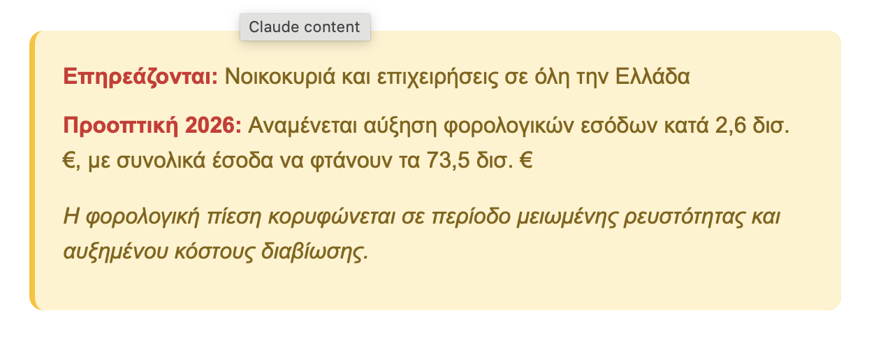 Παρά το βαρύ φορολογικό ημερολόγιο, η επόμενη χρονιά προδιαγράφεται ακόμη πιο απαιτητική. Ο κρατικός προϋπολογισμός του 2026 προβλέπει αύξηση των φορολογικών εσόδων κατά περίπου 2,6 δισ. ευρώ, με τα συνολικά έσοδα να προσεγγίζουν τα 73,5 δισ. ευρώ. Αναμένεται μικρή μείωση στον φόρο φυσικών προσώπων, αλλά αύξηση στα έσοδα από επιχειρήσεις και έμμεσους φόρους.