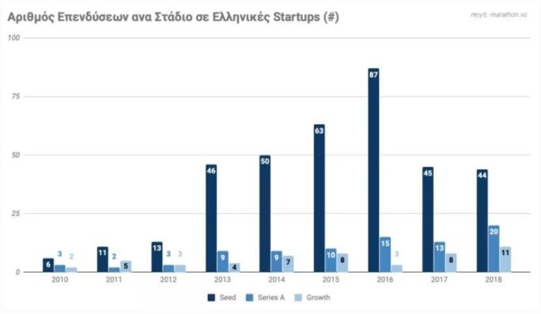Το παραπάνω διάγραμμα χωρίζει τον αριθμό των επενδύσεων σε στάδια, ανάλογα με την ωριμότητα κάθε επιχείρησης. Ως Seed αναφέρονται οι αρχικοί γύροι επένδυσης, τυπικά ύψους 0,1 – 5 εκ. δολαρίων, που αξιοποιούνται πρωτίστως για ανάπτυξη προϊόντος. Οι Series A γύροι επένδυσης έχουν ύψος που εκτείνεται από 1 – 30 εκ. δολάρια και αναφέρονται σε περισσότερο ώριμες εταιρείες που εστιάζουν επίσης στην εμπορική αξιοποίηση του προϊόντος τους, ενώ οι επενδύσεις Growth αναφέρονται σε επόμενα στάδια και αξιοποιούνται για περαιτέρω επέκταση δραστηριοτήτων.