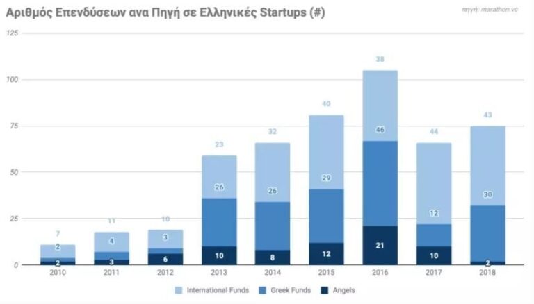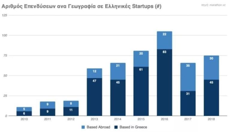Αναφορικά με τα ποσά επένδυσης, η αναλογία αντιστρέφεται, καθώς εταιρείες Ελλήνων ιδρυτών που δεν διατηρούν ομάδα στην Ελλάδα άντλησαν το 73% των συνολικών κεφαλαίων. Ωστόσο, η αύξηση του όγκου επενδύσεων σε εταιρείες που διατηρούν ομάδα στην χώρα παραμένει, αν μη τι άλλο, σημαντική, καθώς το σχετικό ποσό αυξήθηκε κατά 16 φορές, από 10 εκ. δολάρια το 2010 σε 155 εκ. δολάρια το 2018.