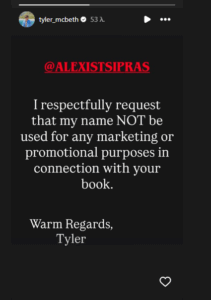 Μέσω story που ανέβασε στο Instagram, ο Τάιλερ Μακμπέθ απευθύνεται στον Αλέξη Τσίπρα γράφοντάς του: «Ζητώ με σεβασμό το όνομά μου να ΜΗ χρησιμοποιείται για οποιονδήποτε σκοπό σκοπό διαφήμισης ή προώθησης σε σχέση με το βιβλίο σας».