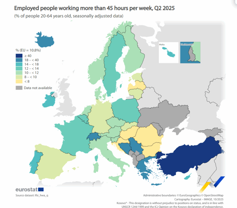 Η Ελλάδα κατέγραψε το υψηλότερο ποσοστό εργαζομένων που δουλεύουν πάνω από 45 ώρες την εβδομάδα στην Ευρωπαϊκή Ένωση, σύμφωνα με τα νεότερα τριμηνιαία στοιχεία της Eurostat για το δεύτερο τρίμηνο του 2025. Συγκεκριμένα, το 20,9% των Ελλήνων εργαζομένων ηλικίας 20-64 ετών εργάστηκε πάνω από 45 ώρες την εβδομάδα, συνδυάζοντας την κύρια και τη δεύτερη εργασία τους.
