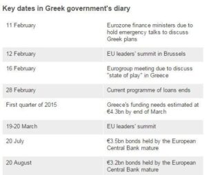 Μια λίστα με τις κρίσιμες ερχόμενες συναντήσεις της ελληνικής κυβέρνησης δημοσιέυει το βρετανικό δίκτυο BBC. «Η κυβέρνηση αρνείται την Τρόικα με τη γνωστή μορφή της, αλλά ο Βόλφγκανγκ Σόιμπλε από την Κωνσταντινούπολη επέμεινε πως τα πάντα θα πρέπει να κινούνται εντός του παρόντος προγράμματος» αναφέρει το εν λόγω ρεπορτάζ, αναφορικά με τις προθέσεις της Ελληνικής πλευράς, για το ερχόμενο Eurogroup.