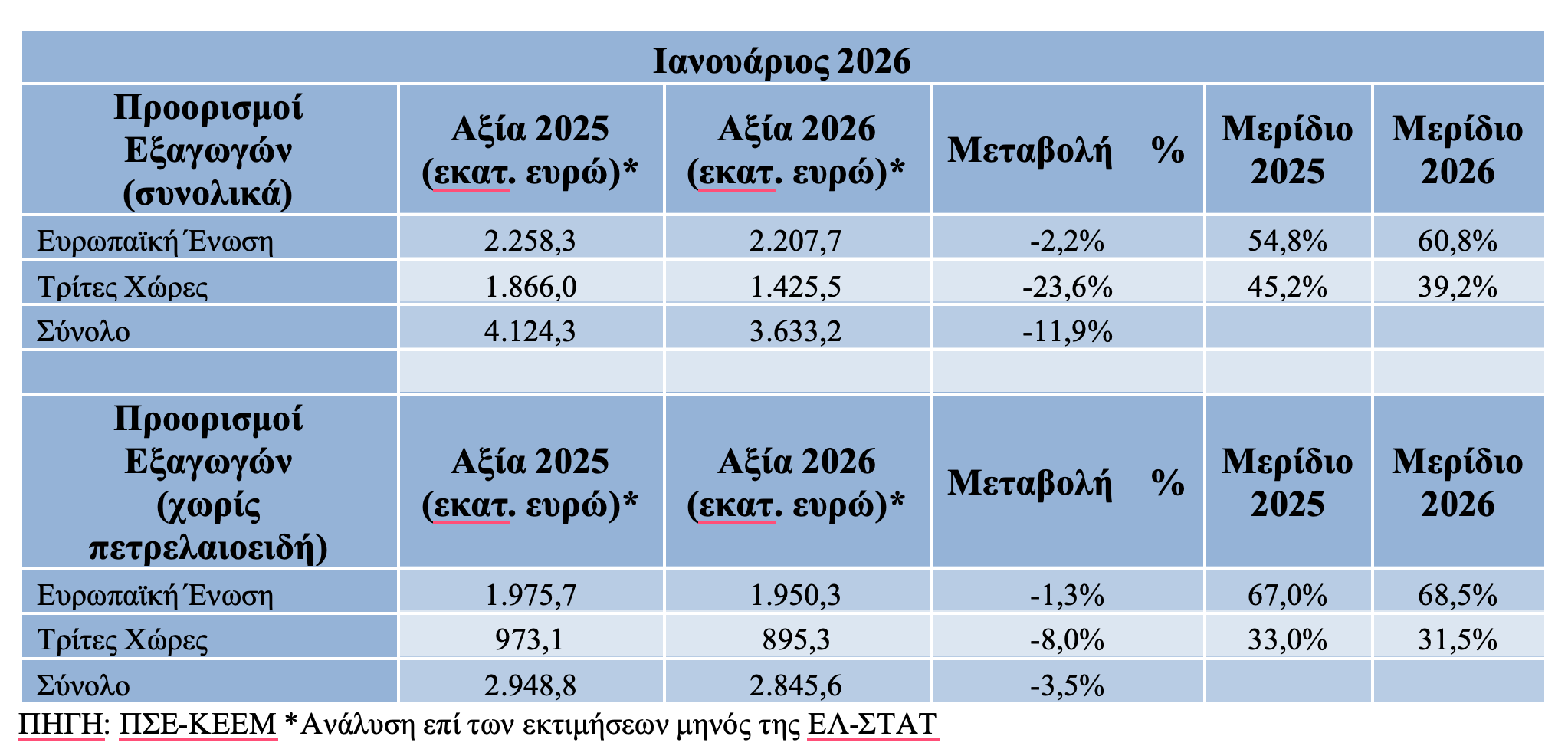 Σύμφωνα με τα προσωρινά στοιχεία της ΕΛ-ΣΤΑΤ, όπως επεξεργάστηκαν ο Πανελλήνιος Σύνδεσμος Εξαγωγέων (ΠΣΕ) και το Κέντρο Εξαγωγικών Ερευνών και Μελετών (ΚΕΕΜ), οι συνολικές εξαγωγές διαμορφώθηκαν στα 3,63 δισ. ευρώ, από 4,12 δισ. ευρώ τον Ιανουάριο του 2025. Η υποχώρηση αγγίζει τα 491 εκατ. ευρώ, ποσοστό -11,9%.